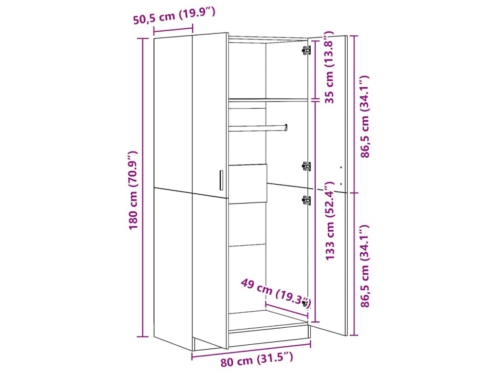 Šatník je vyrobený z prémiového kompozitního dřeva, které je zárukou pevnosti, odolnosti a dlouhé životnosti. Uvnitř se nachází velká přihrádka s šatní tyčí. Najdete zde tudíž spoustu prostoru jak pro zavěšení delších oděvů, tak k uložení poskládaného oblečení, jako jsou svetry či džíny, a menších doplňků, například klobouků, kabelek atd.