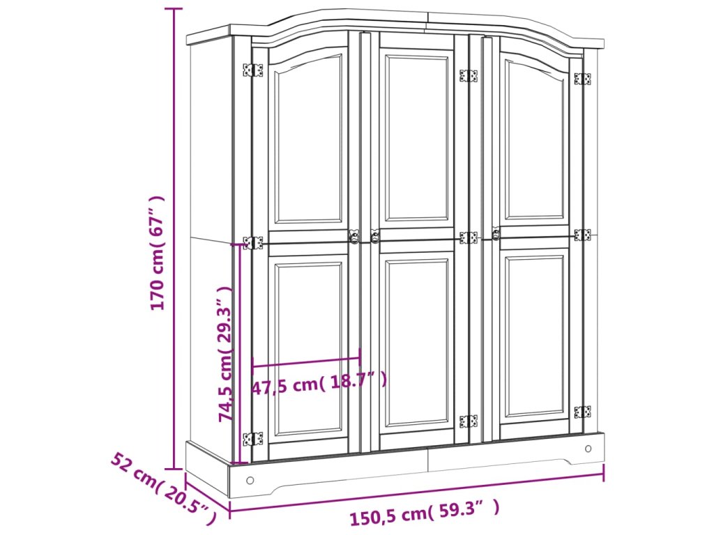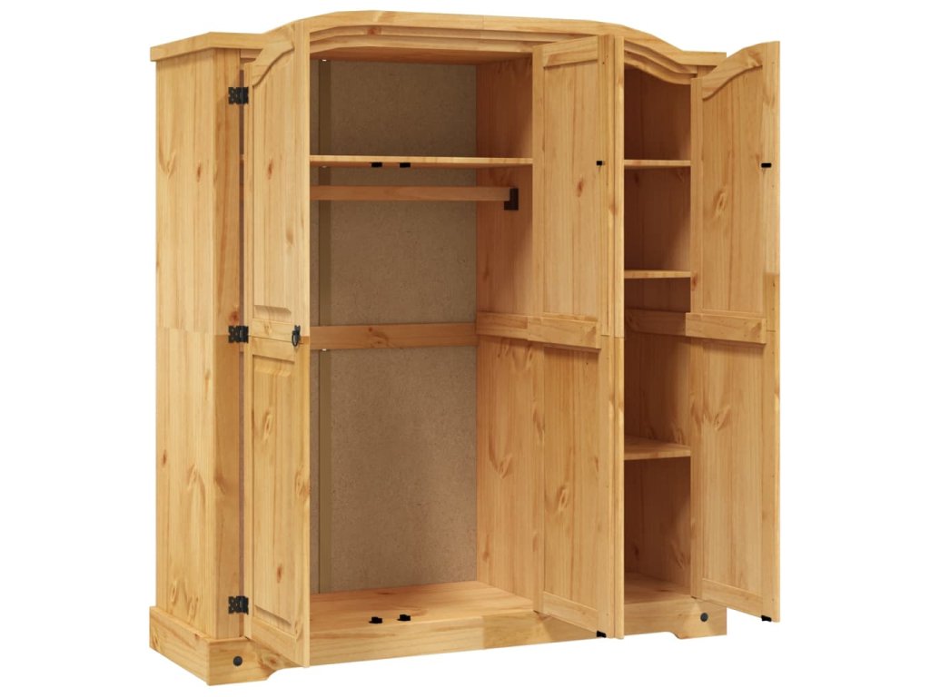 Šatní skříň má krásný klenutý design horní části a 3křídlé dveře. Pevná a bytelná skříň je zhotovená z masivního borového dřeva. V prostorné levé části je horní police a tyč na ramínka pro snadnou organizaci vašeho oblečení. V pravé části skříně jsou čtyři police, které jsou ideální pro vaše spodní prádlo, ponožky apod.