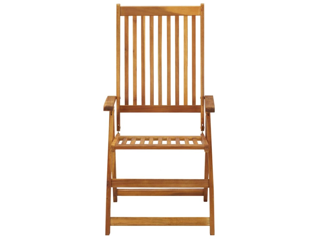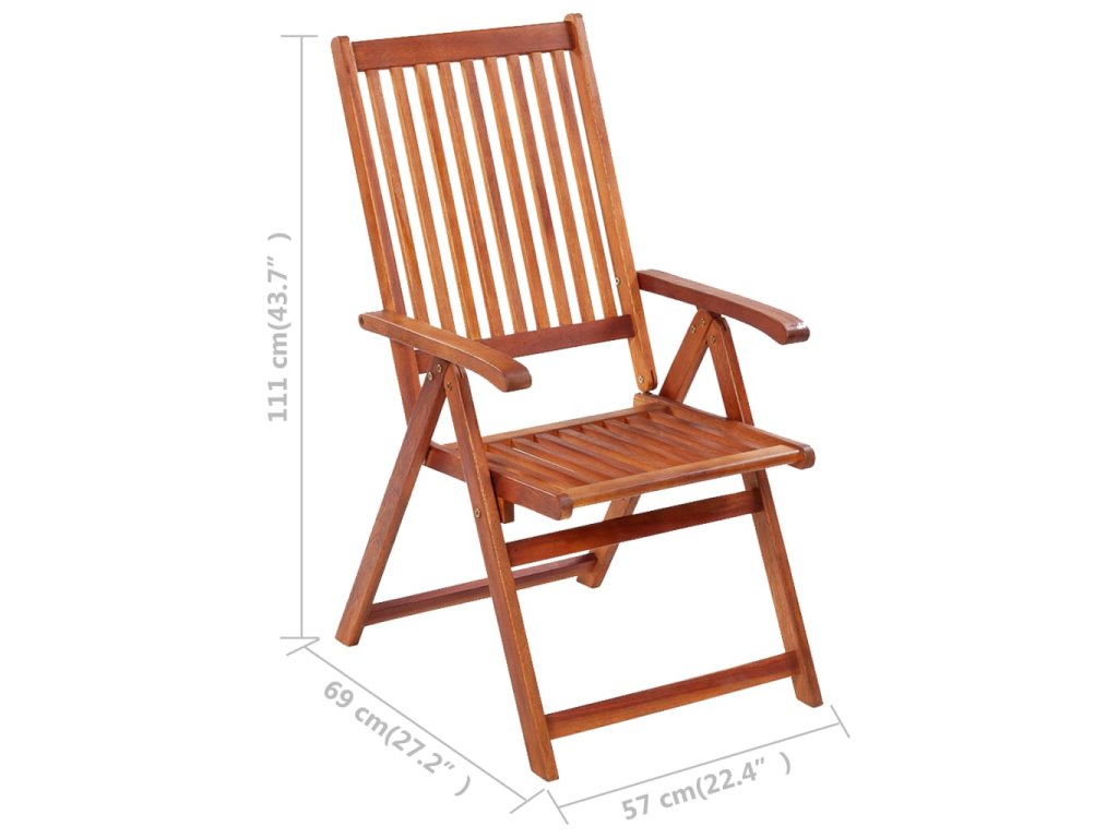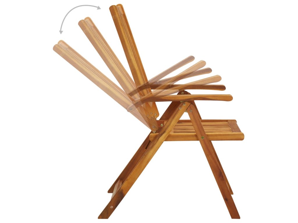 Skládací židle je vyrobená z masivní akácie, což je tropické tvrdé dřevo, které je stabilní a velmi odolné. Povrch je napuštěný olejem, takže se snadno čistí vlhkým hadříkem. Jídelní židle se dá polohovat do 5 pozic, poskytne vám tedy při sezení optimální pohodlí. Židli můžete složit, abyste ušetřili místo, když ji zrovna nepoužíváte. O komfort se vám při relaxaci a odpočinku postarají dodané podušky, které lze na obou stranách upevnit párem šňůrek a elastickým popruhem na opěradlo.