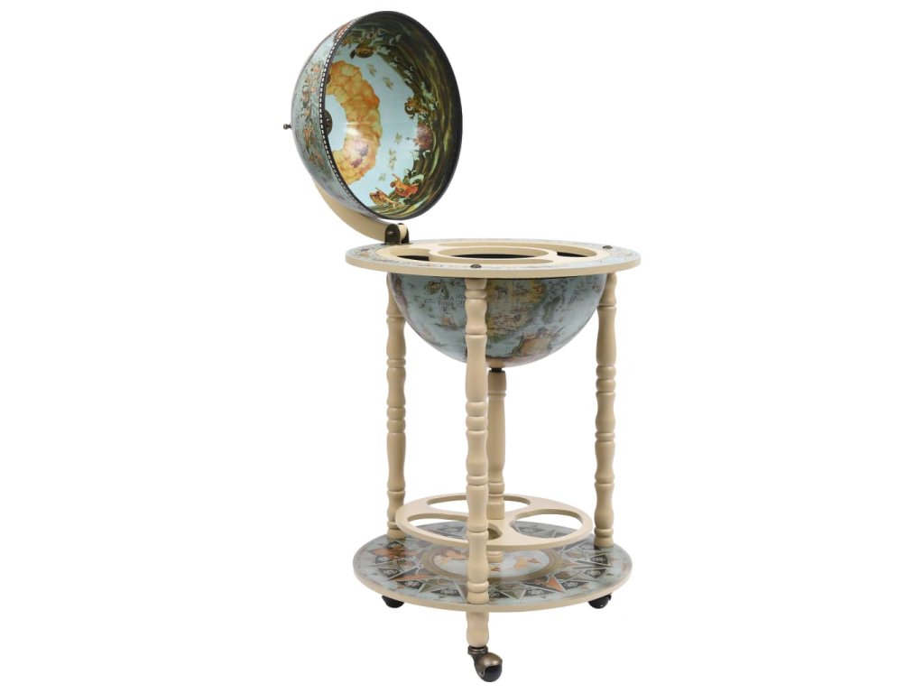 Tento globus bar stojí na kolečkách, takže je snadné ho přemisťovat. Globus představuje starobylou mapu světa. Je vybavený držáky na lahve a sklenice, výborně se proto hodí pro ukládání hned několika lahví a sklenic. Upozorňujeme, že lahve ani sklenice nejsou součástí balení.