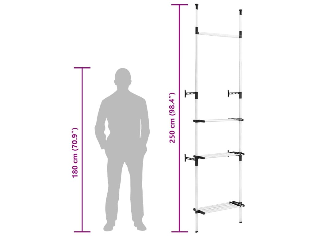 Teleskopický šatní systém je vyrobený z hliníku, takže je odolný a robustní. Tento úložný regál s teleskopickým systémem lze nastavit a přizpůsobit jeho výšku a šířku danému prostoru a vašim požadavkům. Nabízí jedinečný a důmyslný způsob uspořádání šatníku.