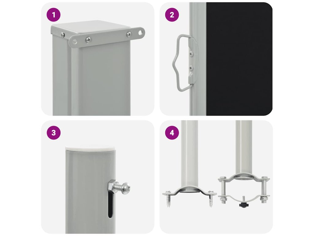 Zástěna je vyrobena z polyesteru, který je odolný proti UV záření a netrhá se. Kazeta, z níž boční markýzu snadno roztáhnete, je ve vertikální pozici posazena na bytelné železné základně. Markýza rovněž disponuje funkcí automatického srolování. Její sestavení je jednoduché.