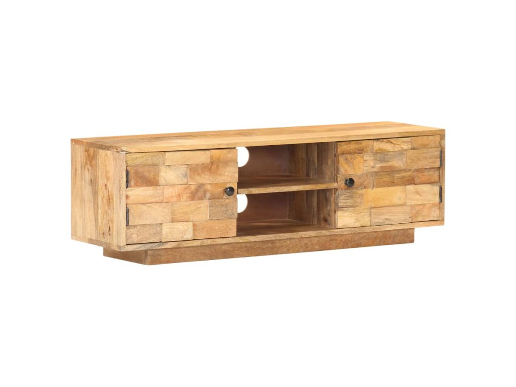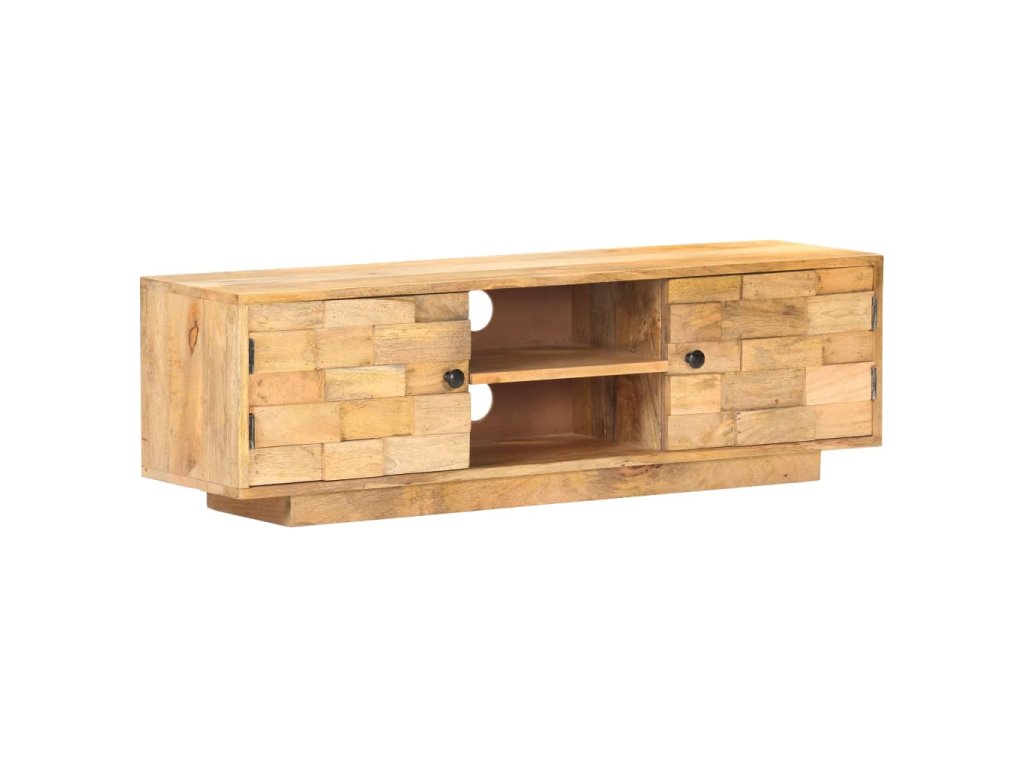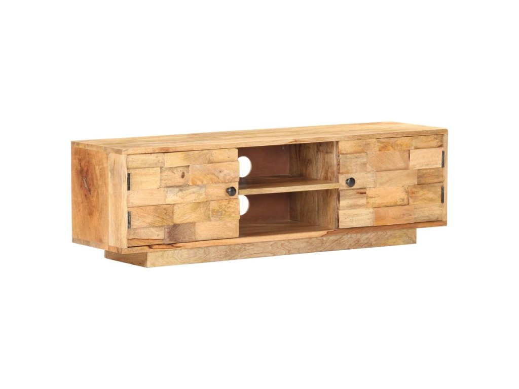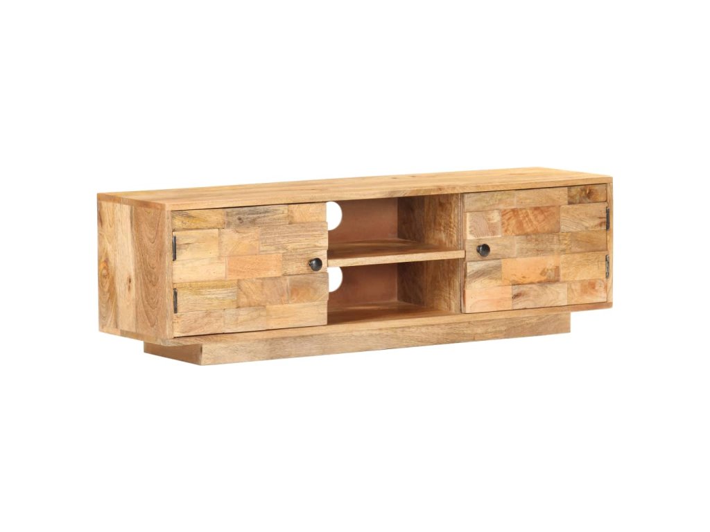 Televizní stolek je vyrobený z masivního mangovníku s povrchem ve stylu přírodních fošen. Toto tropické tvrdé dřevo dokáže unést značnou váhu a skvěle odolává opotřebení i působení času, je tedy velice stabilní a dlouho vám vydrží. Zručné zpracování a nádherná kresba dřeva dávají každému kusu jedinečný charakter, takže nenajdete dva stejné. Skříňka pod TV má dvě přihrádky se dvířky a dvě police, kde najdete spoustu úložného místa. Pevná horní deska je navíc jako dělaná k vystavení nejrůznějších dekorací, jako jsou zarámované fotografie, pokojové rostliny, vázy apod.