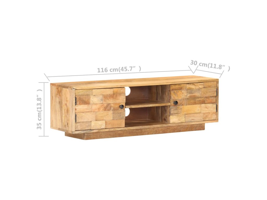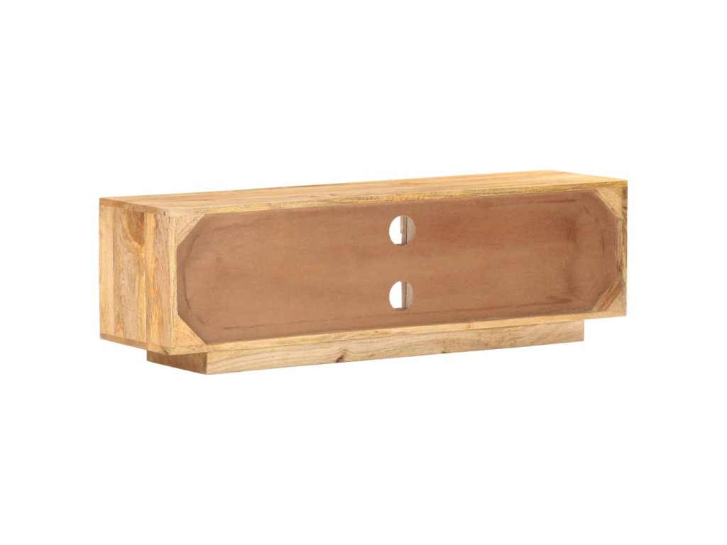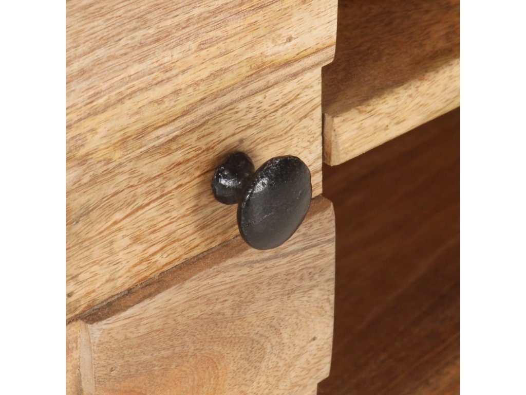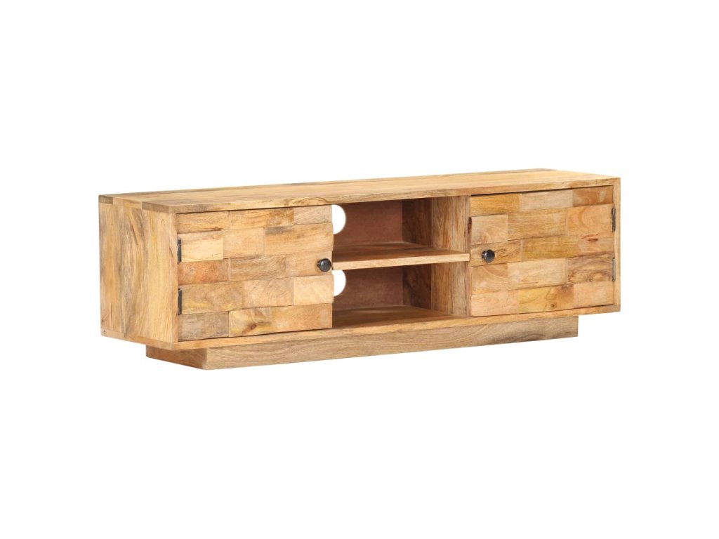 Televizní stolek je vyrobený z masivního mangovníku s povrchem ve stylu přírodních fošen. Toto tropické tvrdé dřevo dokáže unést značnou váhu a skvěle odolává opotřebení i působení času, je tedy velice stabilní a dlouho vám vydrží. Zručné zpracování a nádherná kresba dřeva dávají každému kusu jedinečný charakter, takže nenajdete dva stejné. Skříňka pod TV má dvě přihrádky se dvířky a dvě police, kde najdete spoustu úložného místa. Pevná horní deska je navíc jako dělaná k vystavení nejrůznějších dekorací, jako jsou zarámované fotografie, pokojové rostliny, vázy apod.
