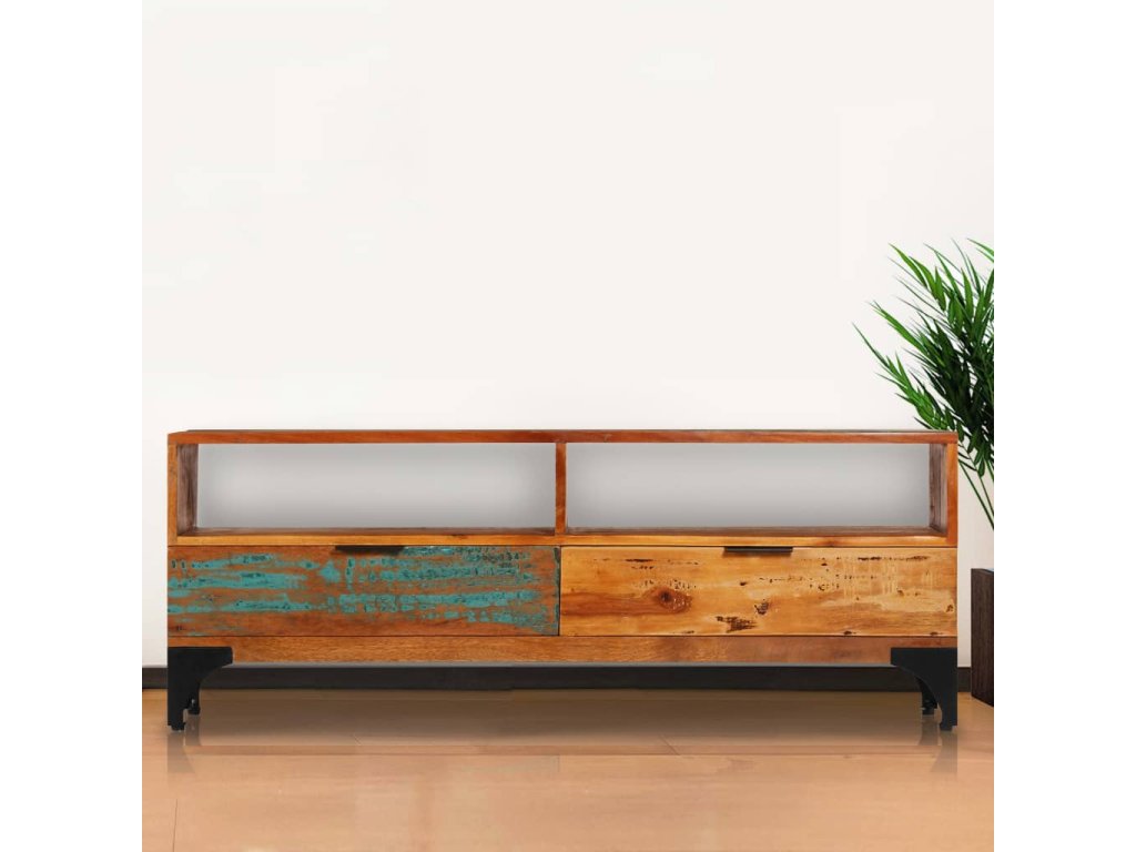 Televizní stolek je vyrobený z překrásného masivního recyklovaného dřeva, které pochází z trámů, podlah a podpěrných nosníků ze starých budov určených k demolici. Obsahuje tedy různé druhy dřeva, jako jsou borovice, teak, buk, dub, cedr, mangovník, akácie apod. Recyklované dřevo tak nabývá působivých vlastností všech těchto rozličných typů dřevin. Navíc je již zestárlé, ošlehané a vyschlé, takže se nesmršťuje ani neohýbá. Nízká skříňka je celá ručně vyrobená, a jelikož nádherná kresba dřeva je v každém kusu unikátní, i vaše skříňka bude naprosto jedinečná a lehce odlišná od všech ostatních. Robustní ocelové nohy podtrhují její industriální vzhled. Stolek pod TV navíc disponuje 2 zásuvkami a 2 přihrádkami, jež vám poskytnou spoustu místa k uspořádání vašich multimediálních zařízení, knížek a všelijakých dalších věcí. Nohy lze ke stolku připevnit velice snadno.
