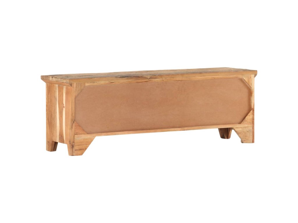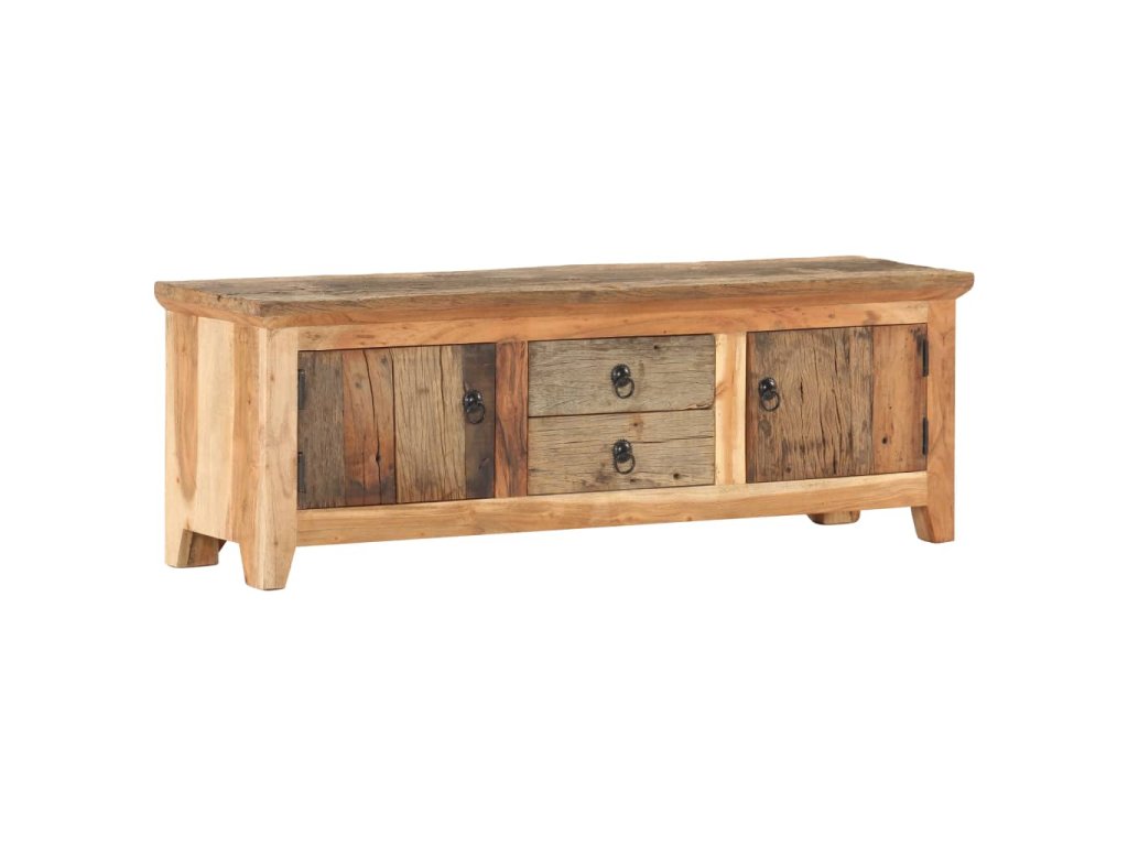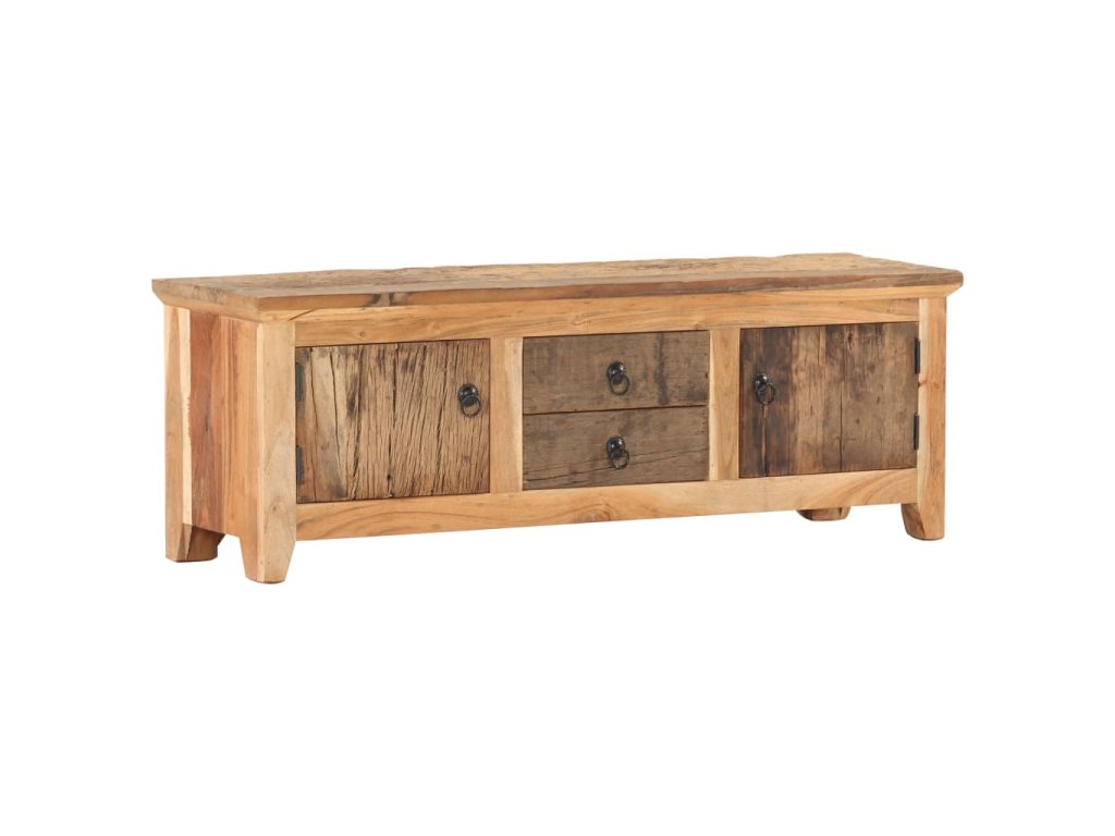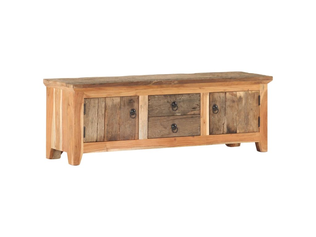 TV skříňka je vyrobená z masivního akáciového a recyklovaného dřeva, které pochází z trámů, podlah a podpěrných nosníků starých budov určených k demolici. Sestává tedy z různých druhů dřeva, jako je borovice, teak, dub, mangovník, akácie apod. Recyklované dřevo tak nabývá vlastností všech těchto rozličných typů dřevin. Navíc je již zestárlé, ošlehané a vyschlé, takže se nesmršťuje ani neohýbá. Stereo skříňka má 2 přihrádky a 2 zásuvky, do kterých si můžete přehledně uložit vše potřebné na dosah ruky.