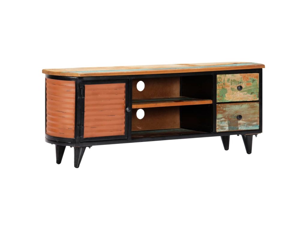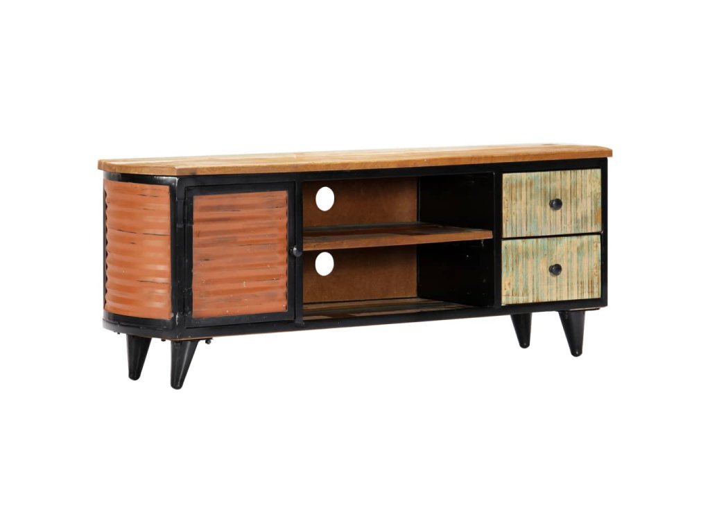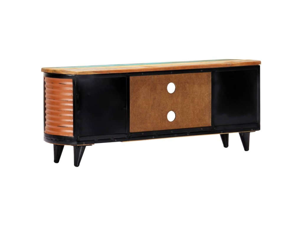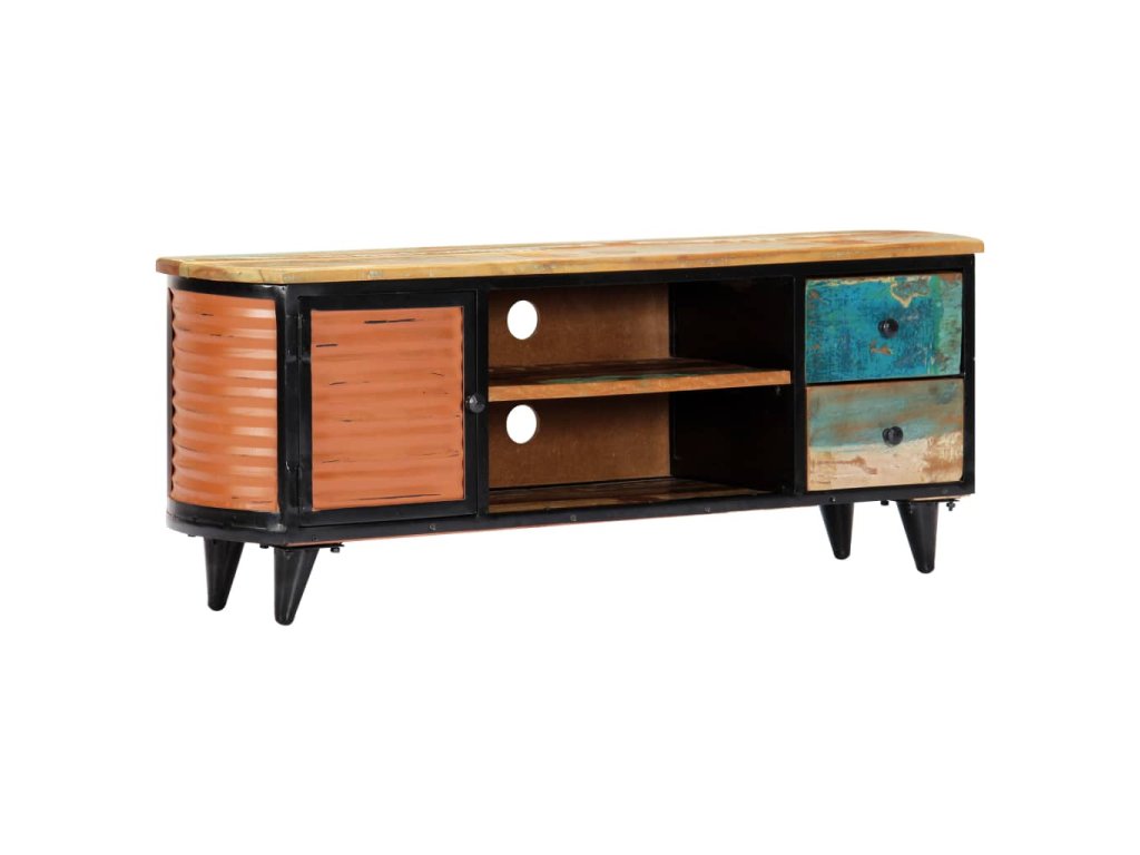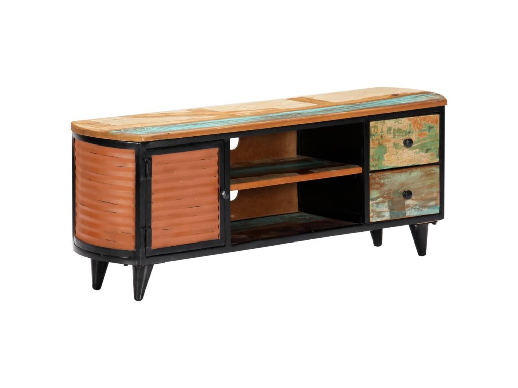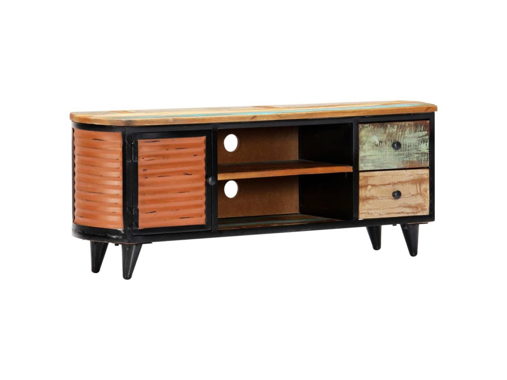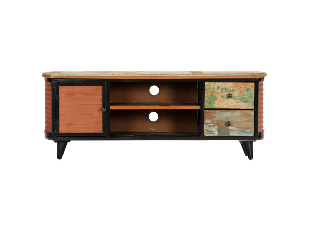 Tato dřevěná TV skříňka z masivního recyklovaného dřeva je jak sofistikovaná, tak elegantní a se svým rámem z práškovaného železa vnese do vašeho bydlení vintage šarm a industriální styl. Jedná se o osobitý doplněk do vašeho domova.
