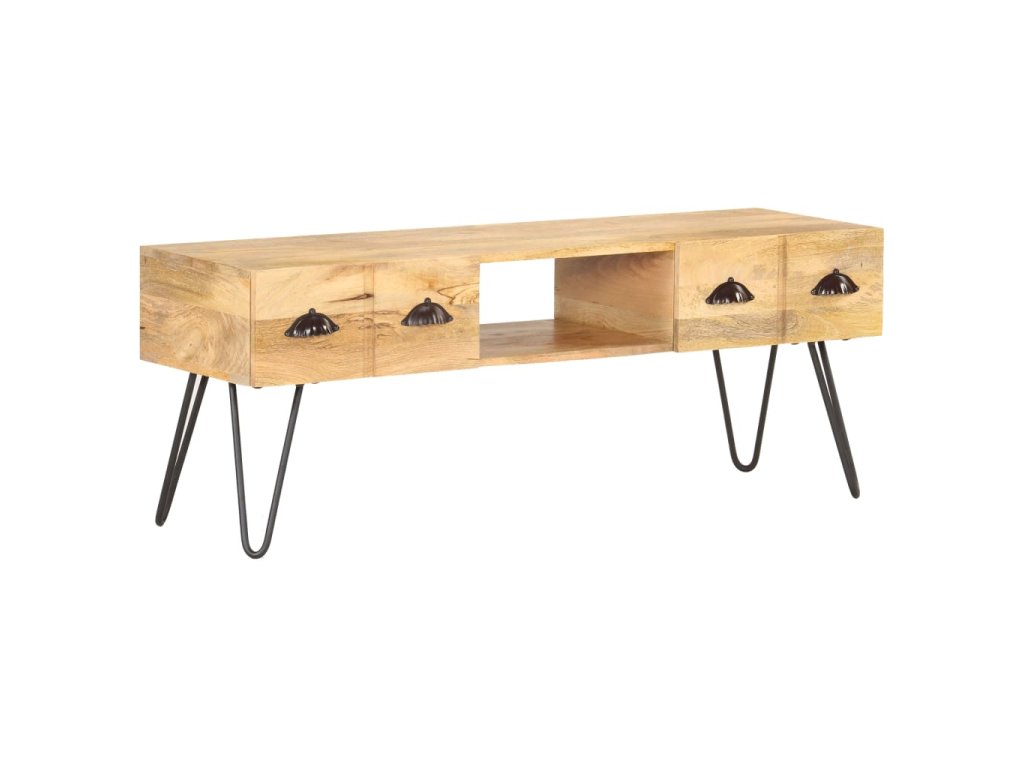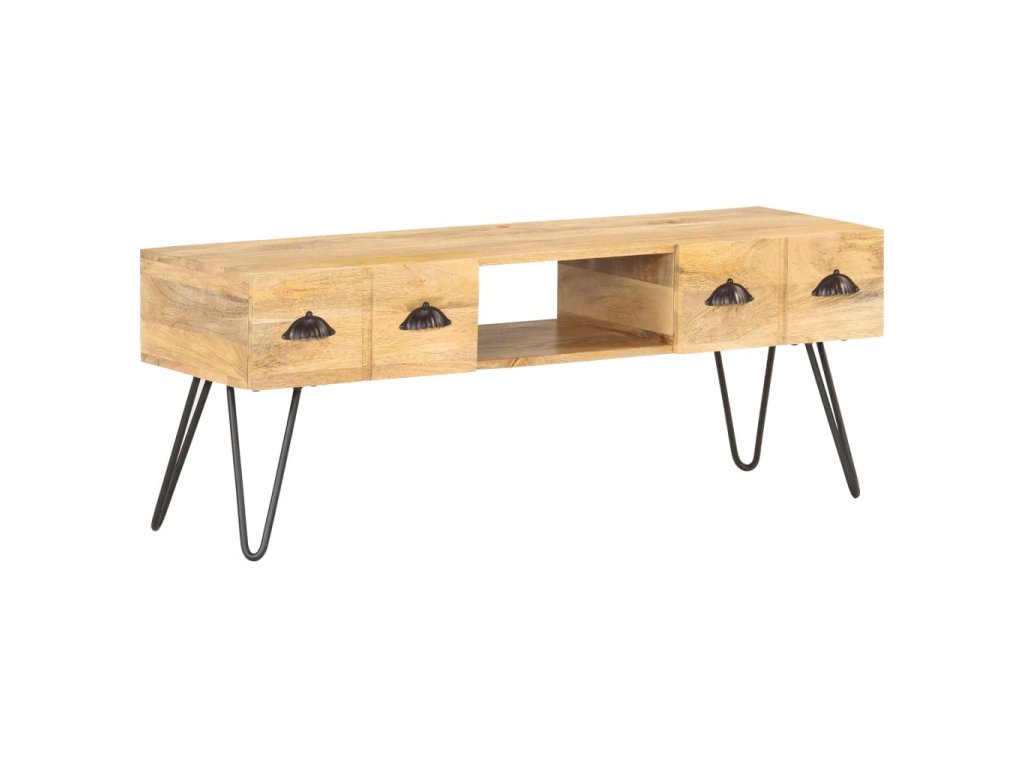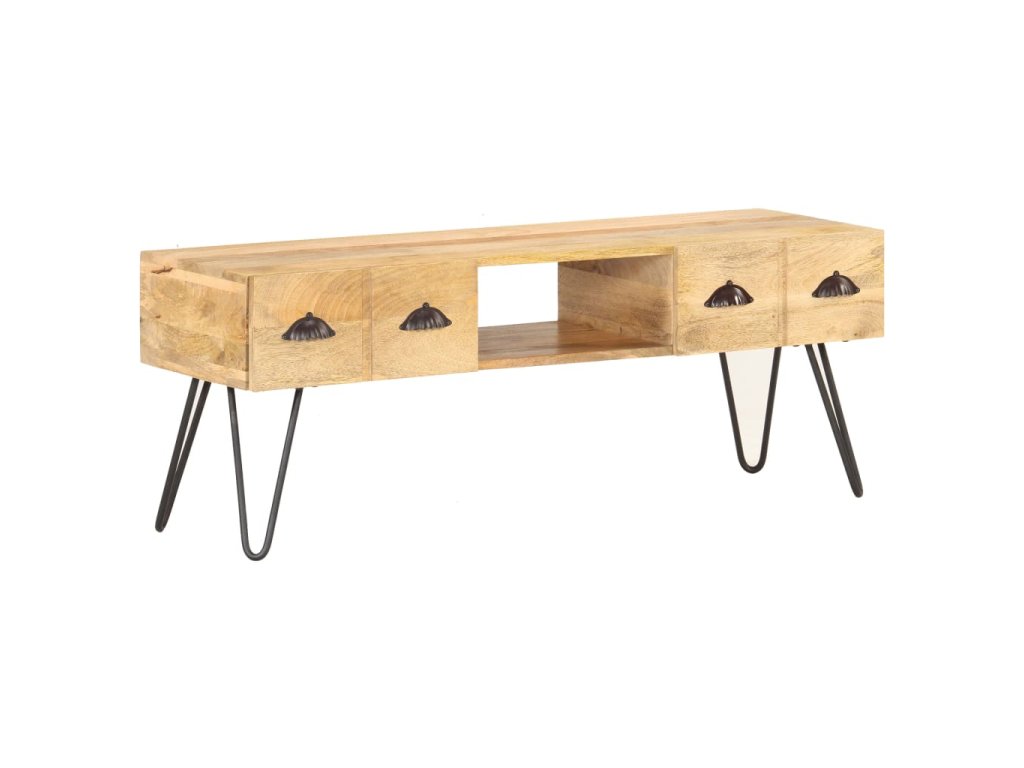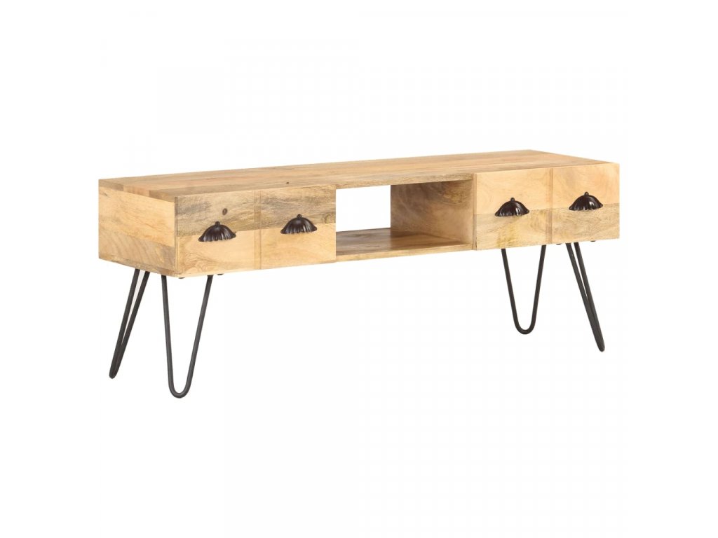 TV stolek je vyrobený z masivního hrubého mangovníkového dřeva. Mangovník je tropické tvrdé dřevo, které unese velkou váhu. Rovněž výborně vzdoruje opotřebení, a proto je příborník stabilní a má dlouhou životnost. Řemeslné zpracování a krásná kresba dřeva dává každému kusu nábytku jeho jedinečný a od všech ostatních mírně odlišný charakter. Tato odkládací skříňka má také 2 zásuvky a otevřenou přihrádku, které poskytují dostatek úložného prostoru pro organizaci důležitých věcí na dosah ruky.