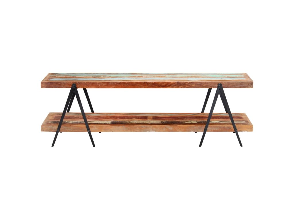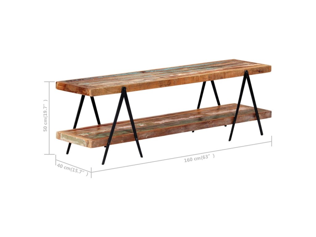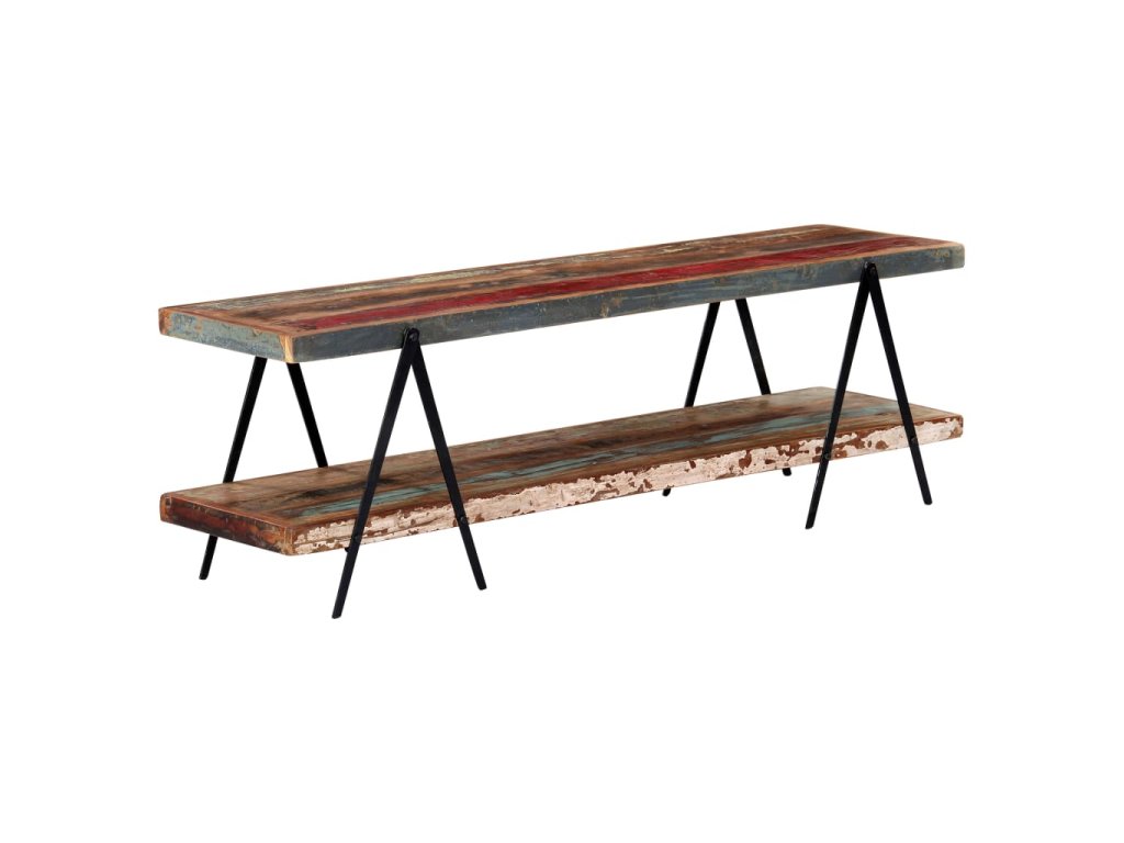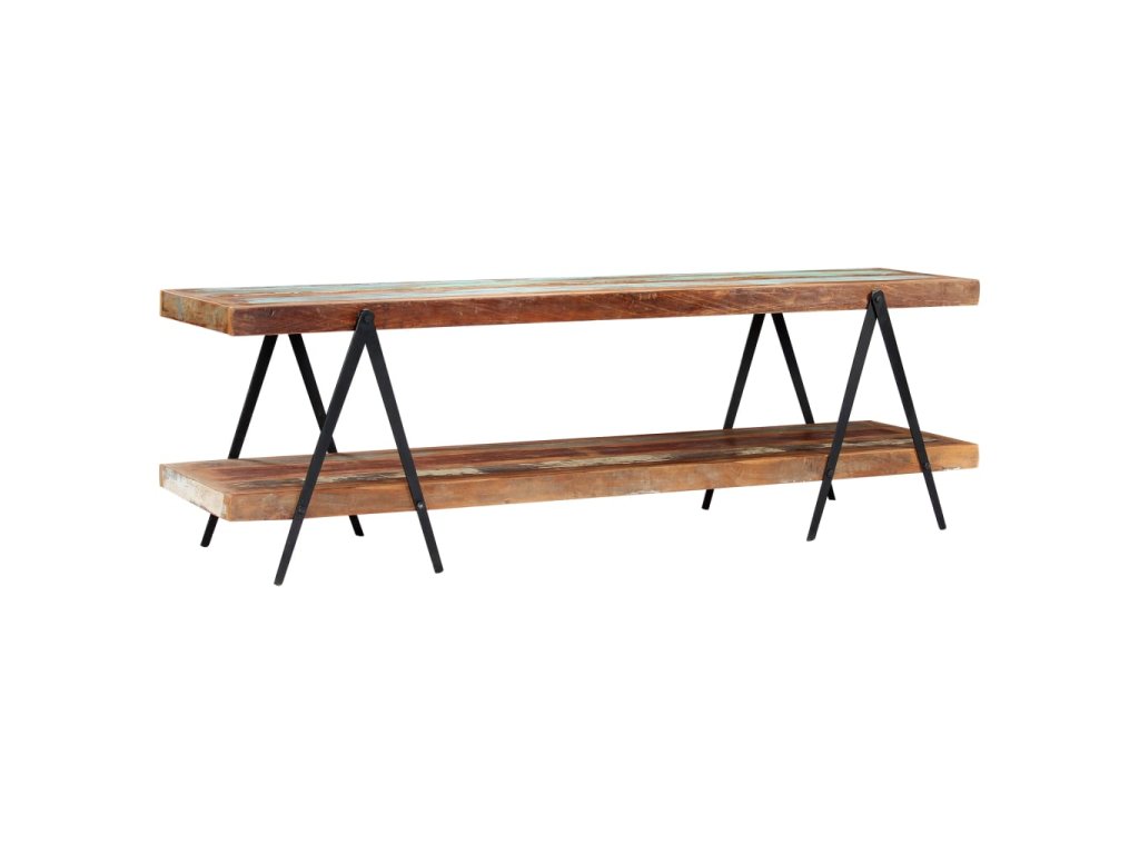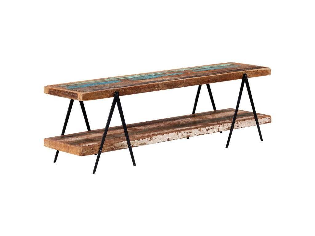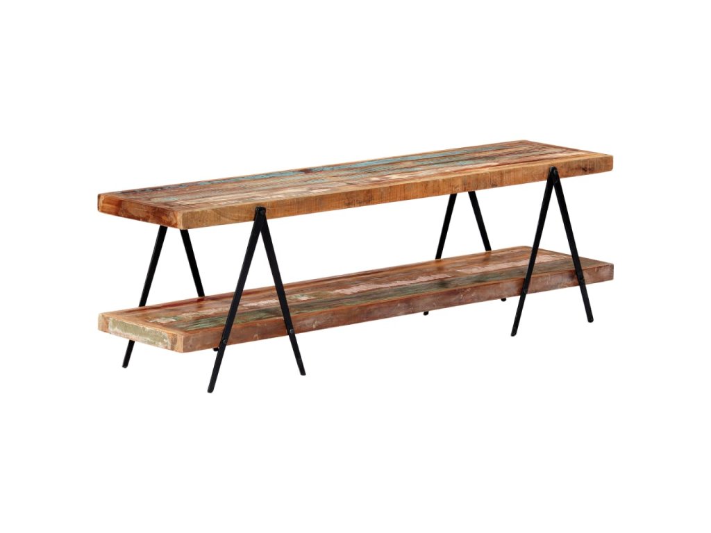 Tato skříňka ve vintage stylu je vyrobená z masivního recyklovaného dřeva, které bylo získáno z trámů, podlah a nosníků ze starých zbořených budov, a může obsahovat různé druhy dřeva, jako je borovice, teak, buk, dub, cedr, mangovníkové dřevo, akácie apod. To znamená, že recyklované dřevo si zachovává vlastnosti všech těchto různých druhů dřeva. Recyklované dřevo je již vyzrálé, zvětralé a sušené, takže se nesmršťuje ani neohýbá. Vynikající řemeslné zpracování a esteticky přitažlivá kresba dřeva dává každému kusu nábytku jedinečný a od všech dalších kusů lehce odlišný charakter. Každý krok výrobního procesu je prováděn s největší péčí, ať už jde o leštění, natírání nebo lakování. Skříňka má 2 prostorné police, kam si snadno uložíte vaše multimédia, knihy a mnoho dalších věcí. Rám z práškovaného železa přispívá k robustní konstrukci a zdůrazňuje industriálním stylem inspirované kouzlo skříňky pod plochou televizi. Sestavení tohoto nábytku je snadné.