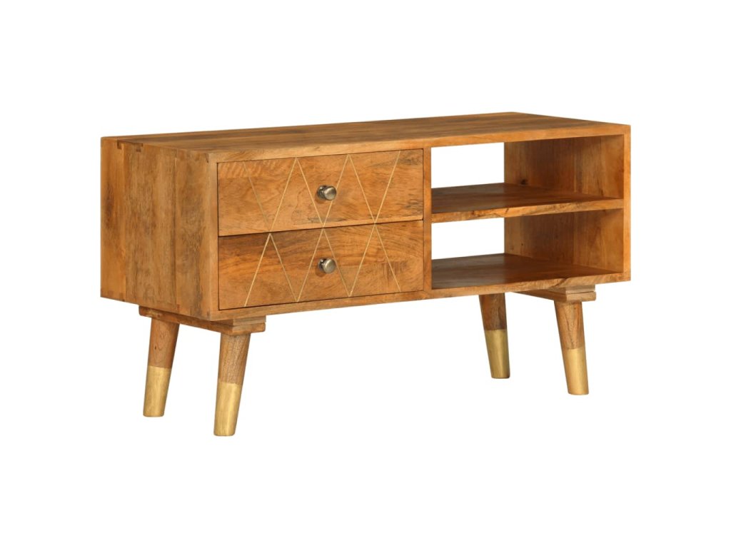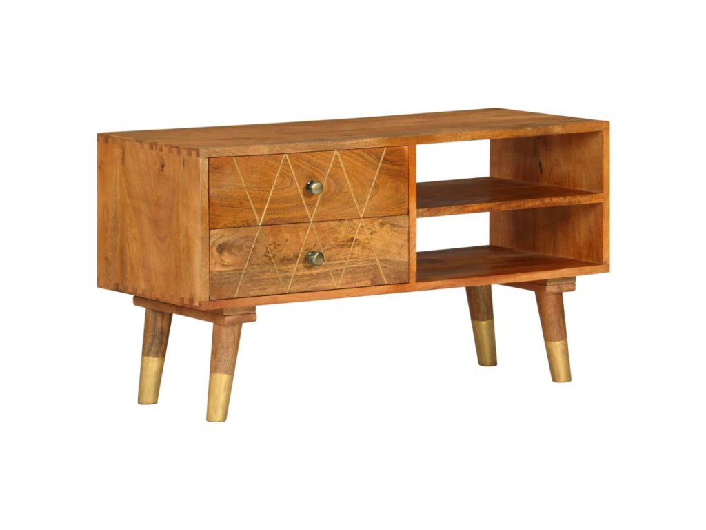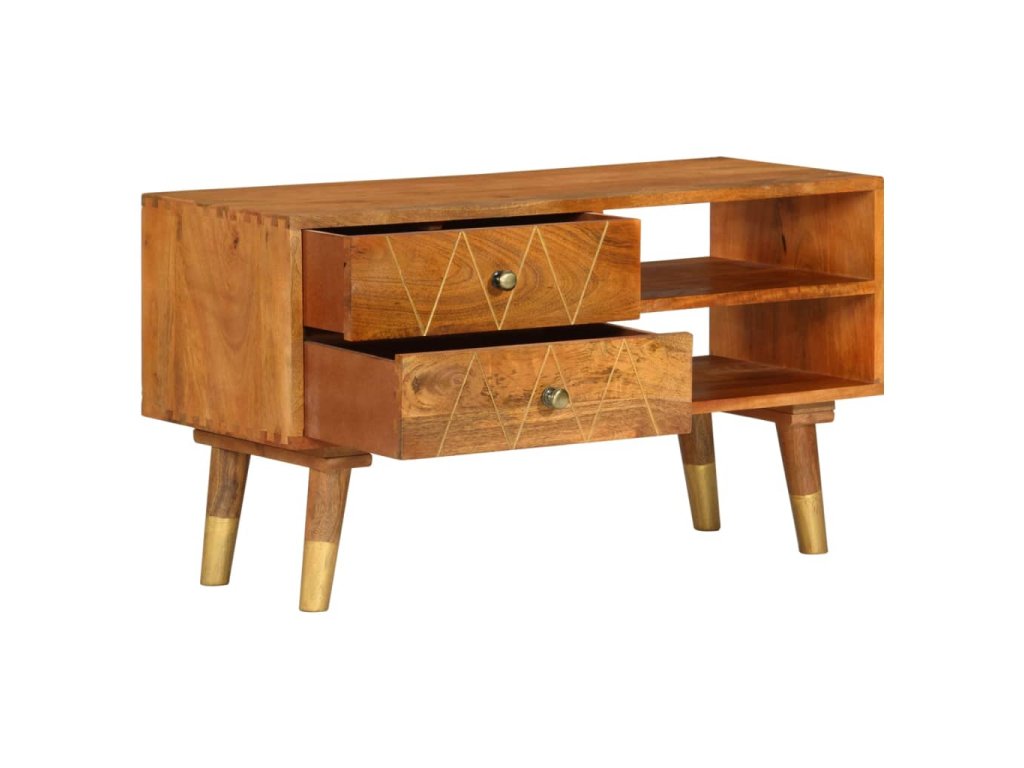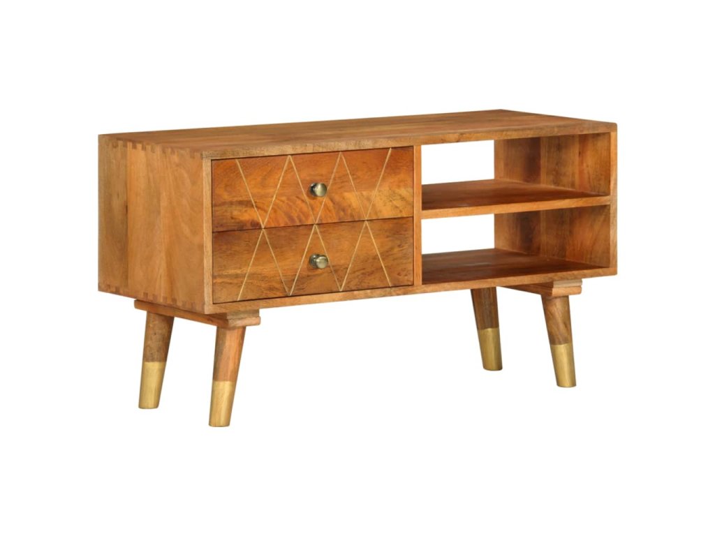 TV stolek je vyrobený z masivního mangovníkového dřeva, které bylo naleštěné a nalakované, aby vynikl jeho půvabný a rafinovaný vzhled. Mangovník má husté a robustní tvrdé dřevo, jehož povrch se vyznačuje nádhernými hnědými či zlatými pruhy a liniemi. Ve stolku jsou 2 zásuvky a 2 otevřené přihrádky, jež vám poskytnou spoustu prostoru, kde si můžete uspořádat různé drobnější předměty, abyste je měli neustále po ruce.