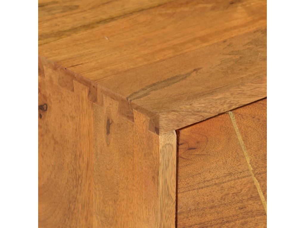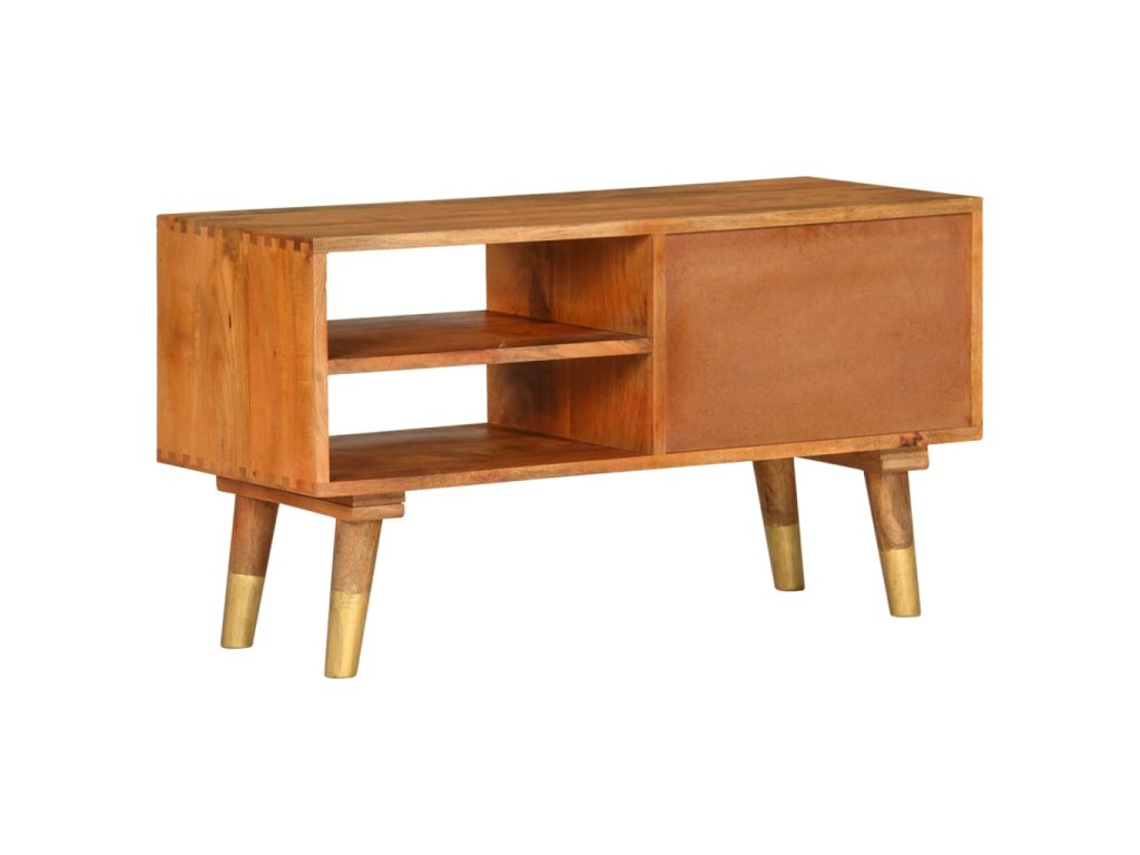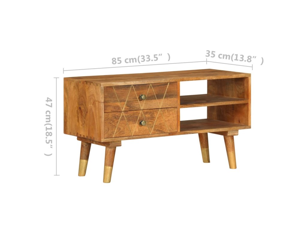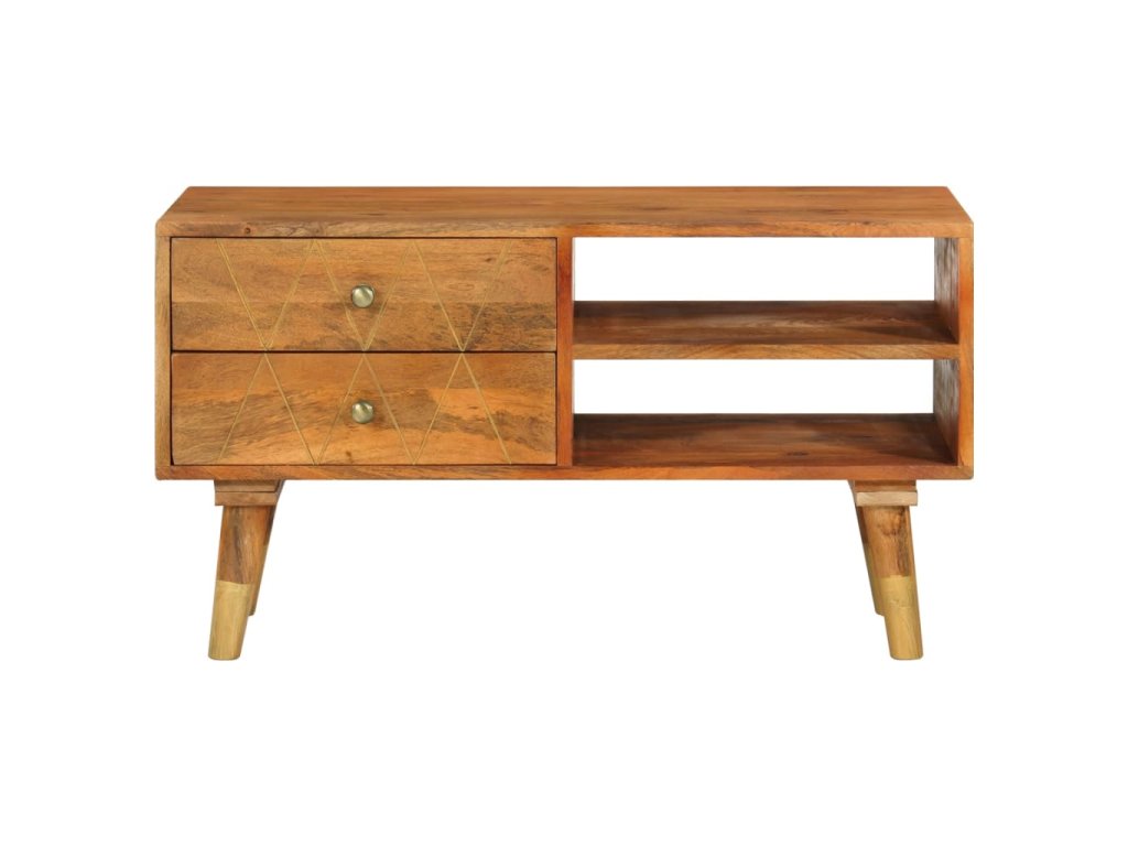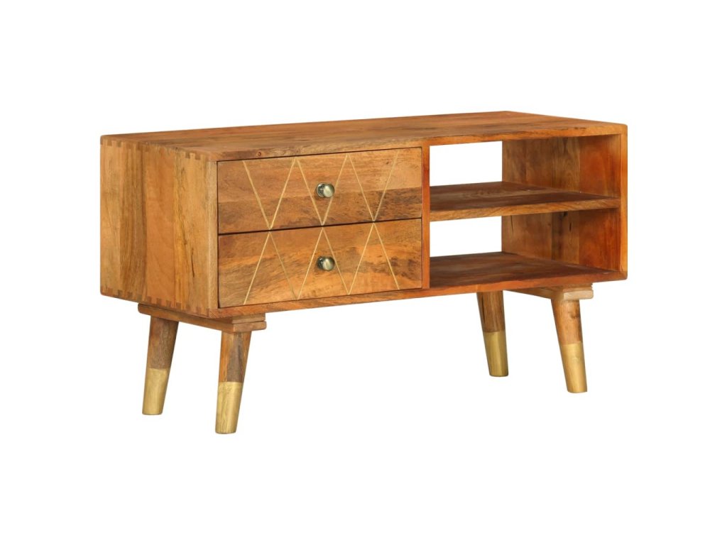 TV stolek je vyrobený z masivního mangovníkového dřeva, které bylo naleštěné a nalakované, aby vynikl jeho půvabný a rafinovaný vzhled. Mangovník má husté a robustní tvrdé dřevo, jehož povrch se vyznačuje nádhernými hnědými či zlatými pruhy a liniemi. Ve stolku jsou 2 zásuvky a 2 otevřené přihrádky, jež vám poskytnou spoustu prostoru, kde si můžete uspořádat různé drobnější předměty, abyste je měli neustále po ruce.
