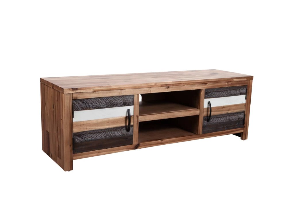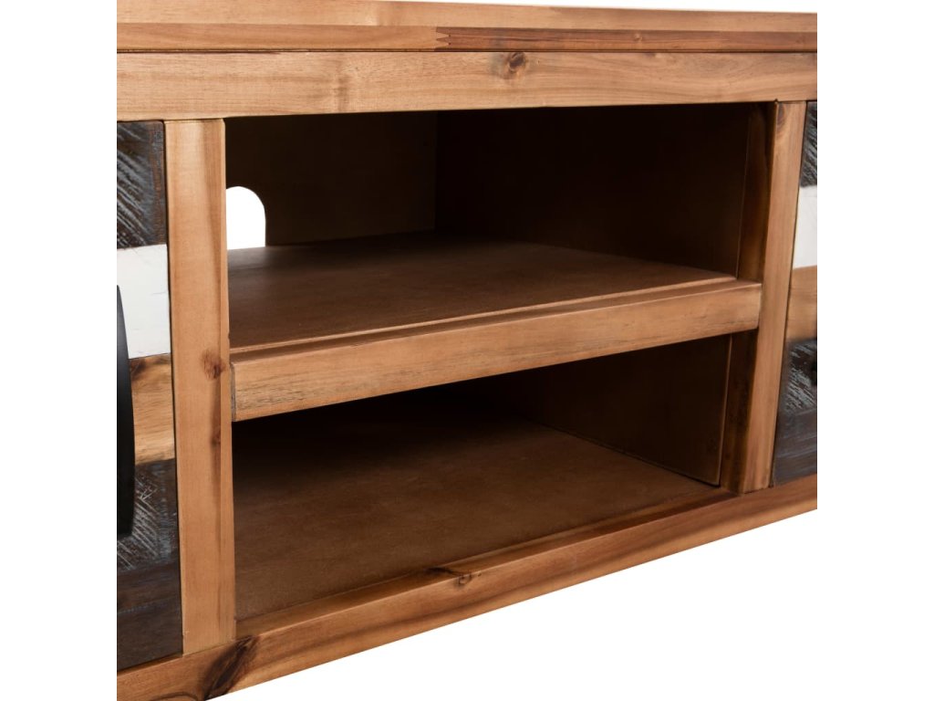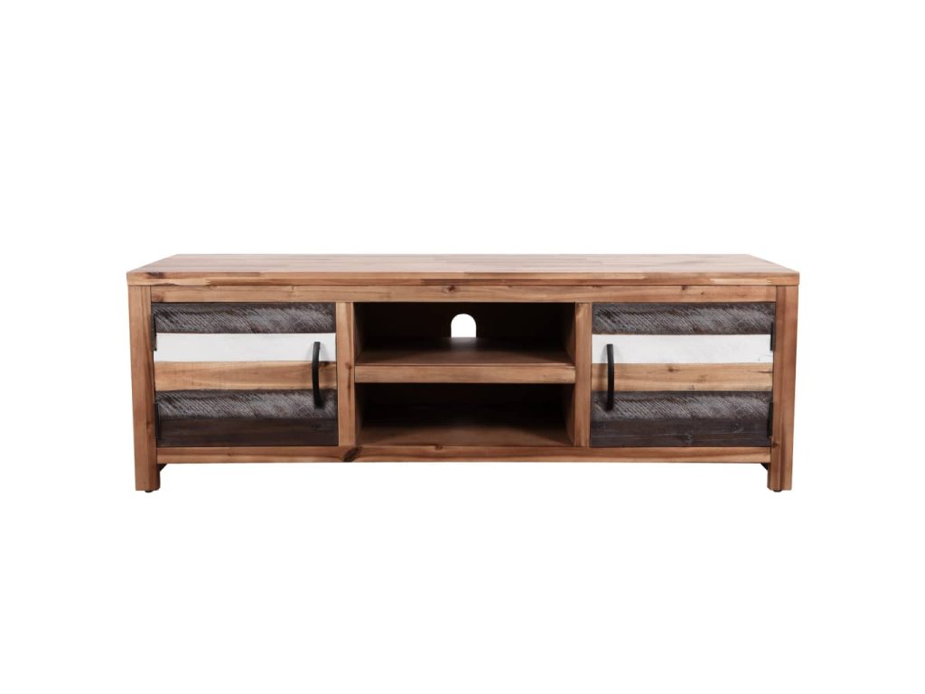 HiFi stolek je vyroben z masivního akáciového dřeva, díky čemuž je velice pevný a odolný. Přední dveře jsou natřeny kontrastní černou a bílou barvou, čímž stolek získal svůj jedinečný vzhled. Stabilní stolní deska se výborně hodí k umístění vaší televize a HiFi věže a k vystavení dekorativních předmětů, jako jsou vázy nebo košíky s ovocem. Spodní polička vám poskytne spoustu místa, kde si můžete přehledně uspořádat váš DVD přehrávač, herní konzole, streamovací zařízení a mediální nosiče. Montáž je snadná.