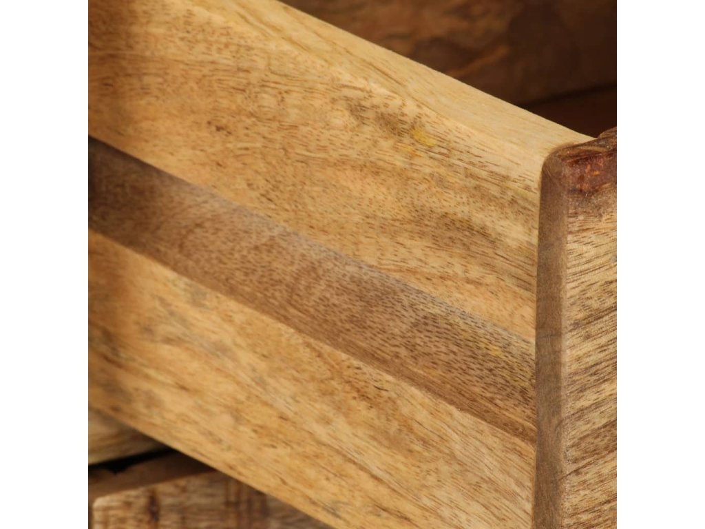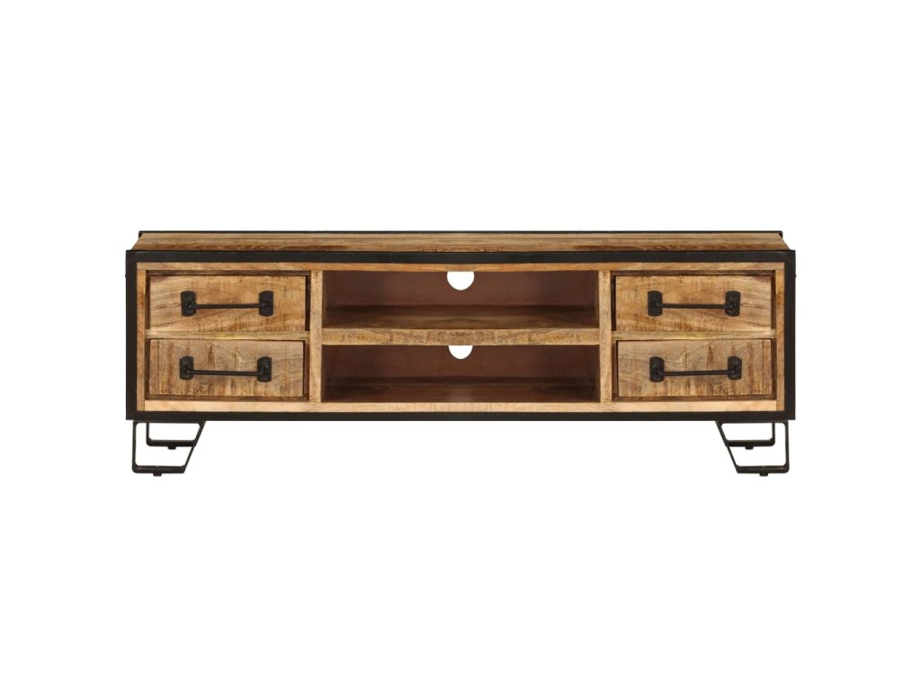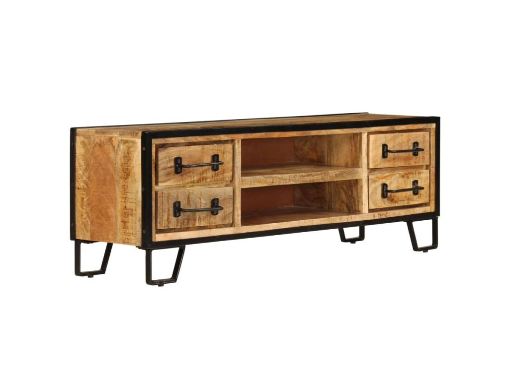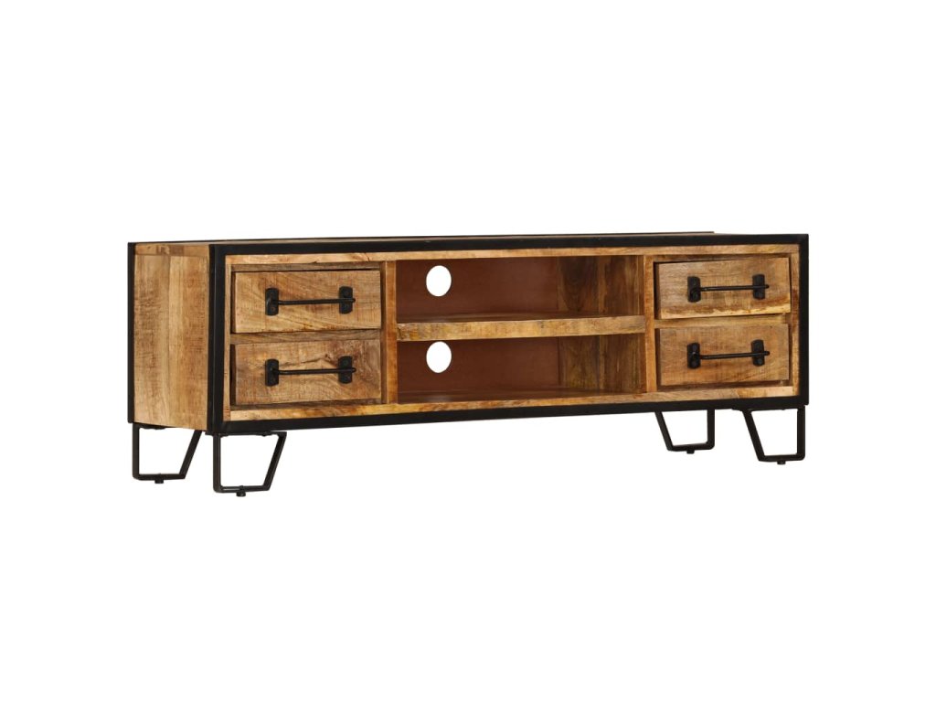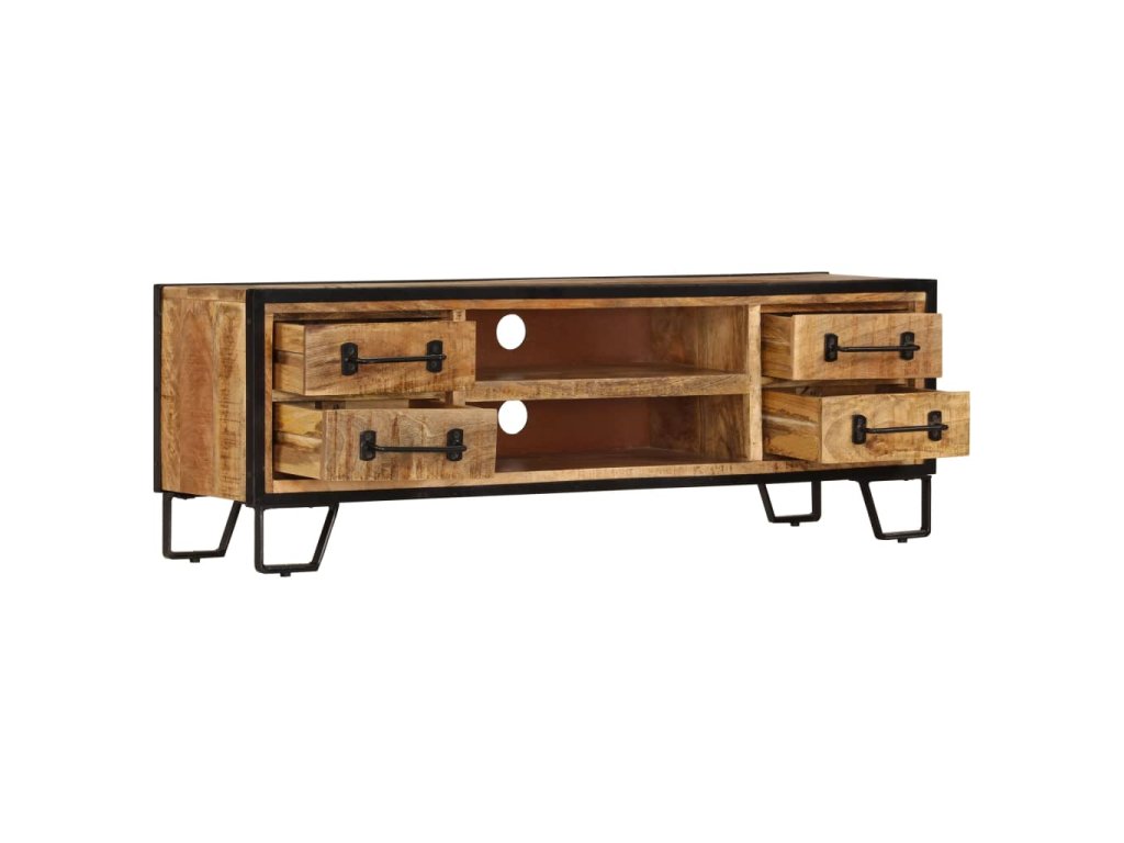 Stolek pod TV je vyrobený z masivního mangovníkového dřeva, které je nejen stabilní a odolné, ale zároveň také krásně vypadá. Zručné zpracování podtrhuje jeho okázalý retro styl. Každá fáze výrobního procesu je prováděna s mimořádnou péčí, ať už se jedná o leštění, natírání anebo lakování. Překrásná kresba dřeva spolu s řemeslnou výrobou činí každý kus nábytku jedinečným a lehce odlišným od ostatních. Ocelové nohy zajišťují vynikající stabilitu TV stolku. Televizní skříňka disponuje 2 přihrádkami a 4 zásuvkami, které vám poskytnou spoustu prostoru, kam si můžete uspořádat své DVD přehrávače, herní konzole, satelitní zařízení a mediální nosiče.