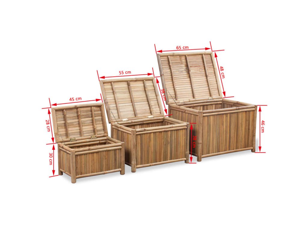 Úložné boxy jsou vyrobeny z vysoce kvalitního bambusu, pro který je typická vysoká odolnost vůči povětrnostním vlivům a trvanlivost. Je snadné je očistit otřením vlhkým hadříkem. Balení obsahuje 3 úložné boxy.