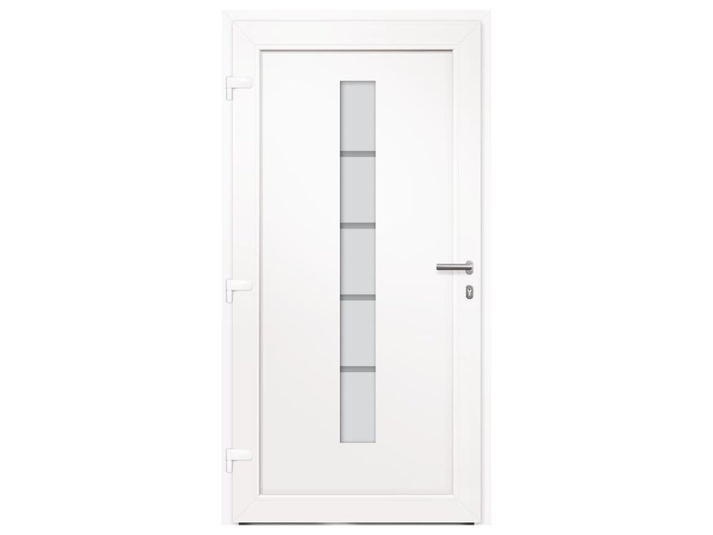Vchodové dveře mají robustní rám i výplň, hliníkový práh, nastavitelné panty, bezpečnostní zámek s jazýčkem a háčkem a 5 stavítky, izolační zasklení a výztuhou z pozinkované oceli. Samotné dveře jsou vyrobené z hliníku a PVC a vyznačují se svou působivou bytelností a vysoce praktickým zamykáním. Obdržíte je spolu s kompletní sadou, která obsahuje nerezovou úchytku, vnitřní kliku, klíče, těsnící pásku a montážní příslušenství.