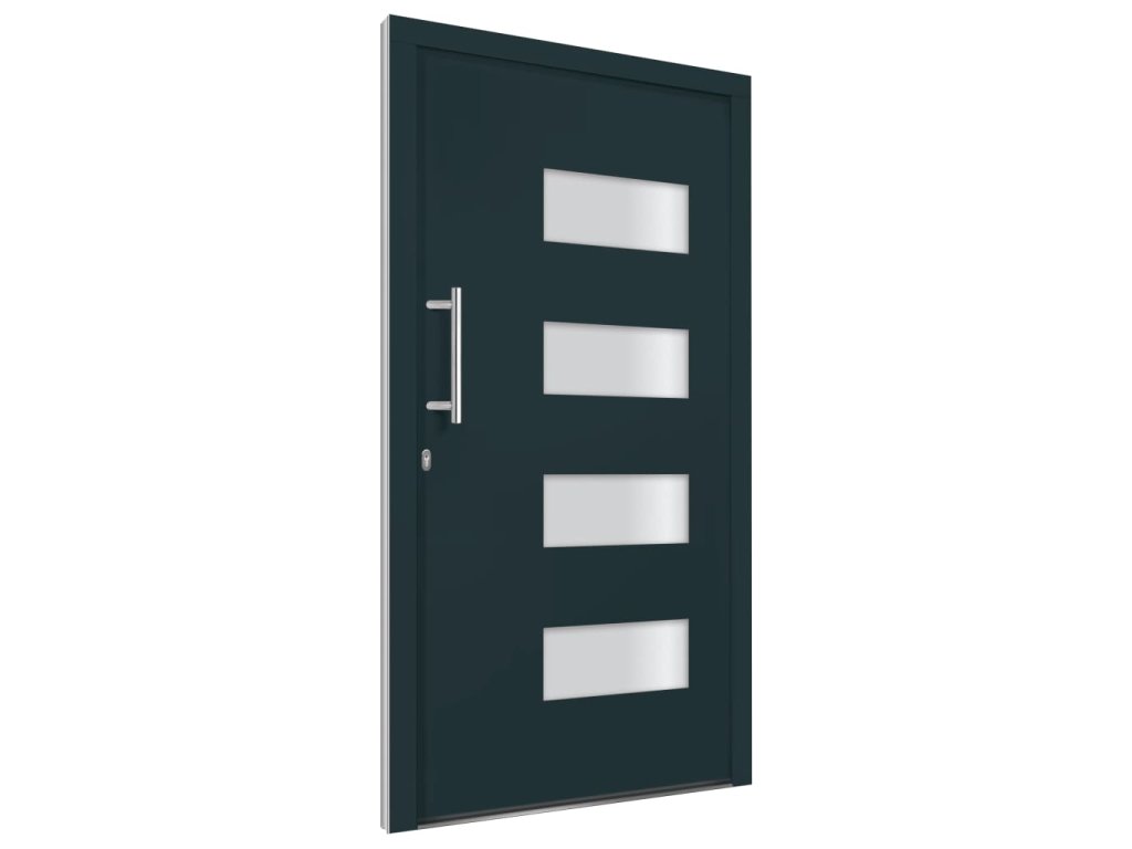 Vchodové dveře mají robustní rám i výplň, hliníkový práh, nastavitelné panty, bezpečnostní zámek s jazýčkem a háčkem a 5 stavítky, izolační zasklení a výztuhou z pozinkované oceli. Samotné dveře jsou vyrobené z hliníku a PVC a vyznačují se svou působivou bytelností a vysoce praktickým zamykáním. Obdržíte je spolu s kompletní sadou, která obsahuje nerezovou úchytku, vnitřní kliku, klíče, těsnící pásku a montážní příslušenství.