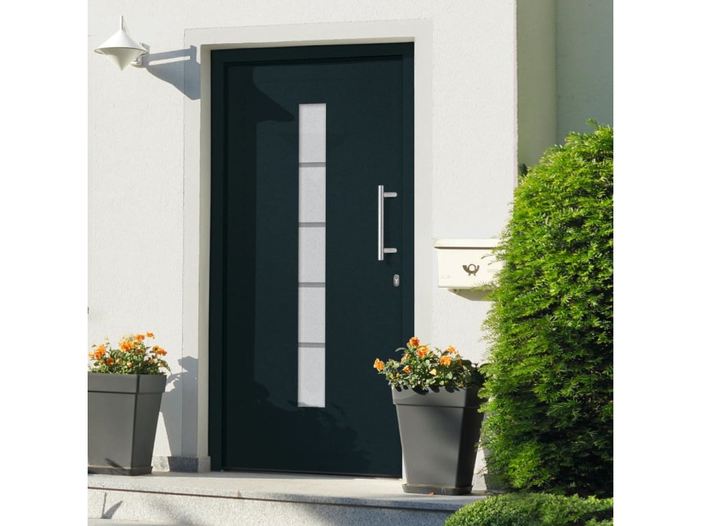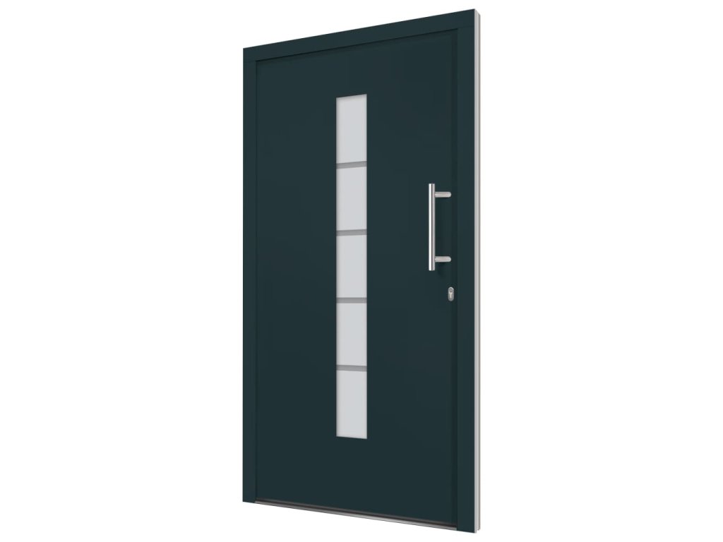 Vchodové dveře mají robustní rám i výplň, hliníkový práh, nastavitelné panty, bezpečnostní zámek s jazýčkem a háčkem a 5 stavítky, izolační zasklení a výztuhou z pozinkované oceli. Samotné dveře jsou vyrobené z hliníku a PVC a vyznačují se svou působivou bytelností a vysoce praktickým zamykáním. Obdržíte je spolu s kompletní sadou, která obsahuje nerezovou úchytku, vnitřní kliku, klíče, těsnící pásku a montážní příslušenství.