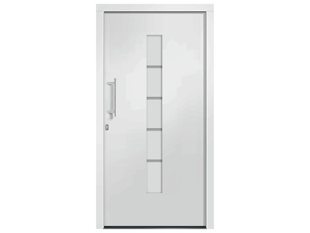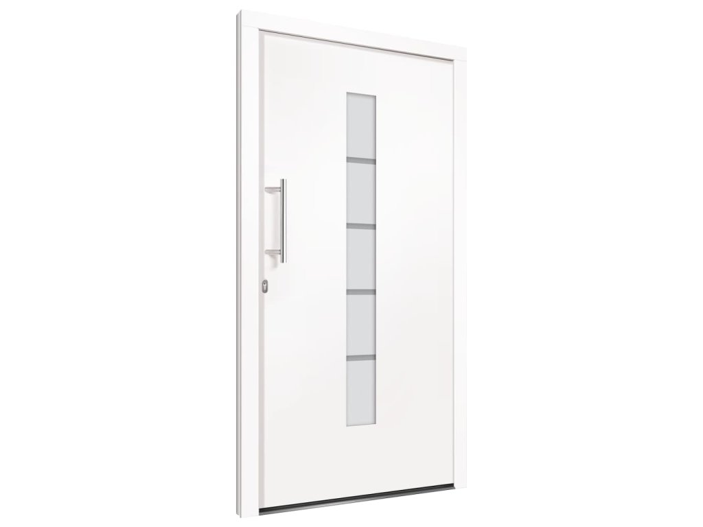 Vchodové dveře mají robustní rám i výplň, hliníkový práh, nastavitelné panty, bezpečnostní zámek s jazýčkem a háčkem a 5 stavítky, izolační zasklení a výztuhou z pozinkované oceli. Samotné dveře jsou vyrobené z hliníku a PVC a vyznačují se svou působivou bytelností a vysoce praktickým zamykáním. Obdržíte je spolu s kompletní sadou, která obsahuje nerezovou úchytku, vnitřní kliku, klíče, těsnící pásku a montážní příslušenství.