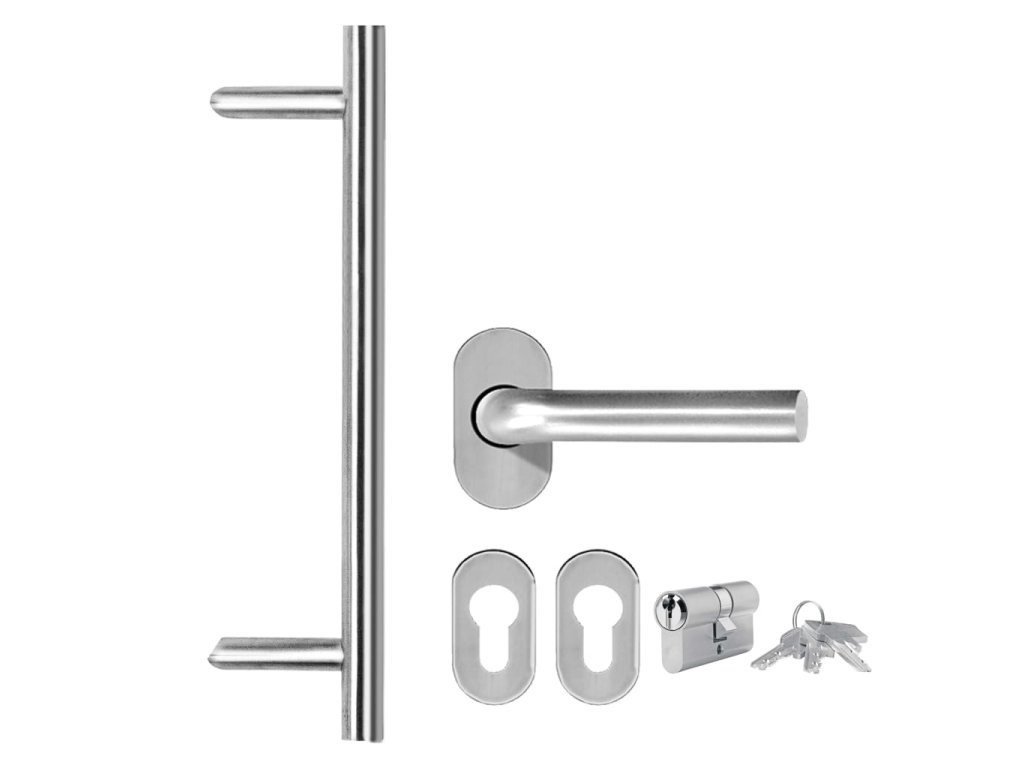 Vchodové dveře mají robustní rám i výplň, hliníkový práh, nastavitelné panty, bezpečnostní zámek s jazýčkem a háčkem a 5 stavítky, izolační zasklení a výztuhou z pozinkované oceli. Samotné dveře jsou vyrobené z hliníku a PVC a vyznačují se svou působivou bytelností a vysoce praktickým zamykáním. Obdržíte je spolu s kompletní sadou, která obsahuje nerezovou úchytku, vnitřní kliku, klíče, těsnící pásku a montážní příslušenství.
