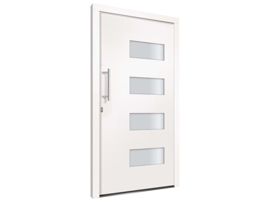 Vchodové dveře mají robustní rám i výplň, hliníkový práh, nastavitelné panty, bezpečnostní zámek s jazýčkem a háčkem a 5 stavítky, izolační zasklení a výztuhou z pozinkované oceli. Samotné dveře jsou vyrobené z hliníku a PVC a vyznačují se svou působivou bytelností a vysoce praktickým zamykáním. Obdržíte je spolu s kompletní sadou, která obsahuje nerezovou úchytku, vnitřní kliku, klíče, těsnící pásku a montážní příslušenství.