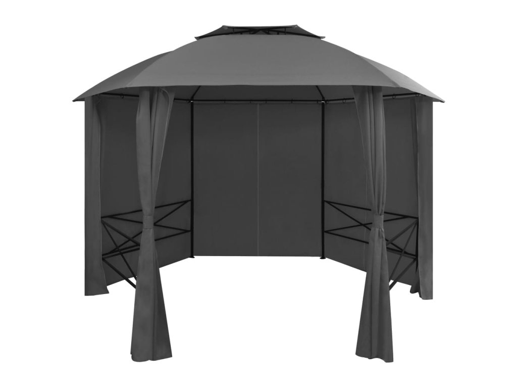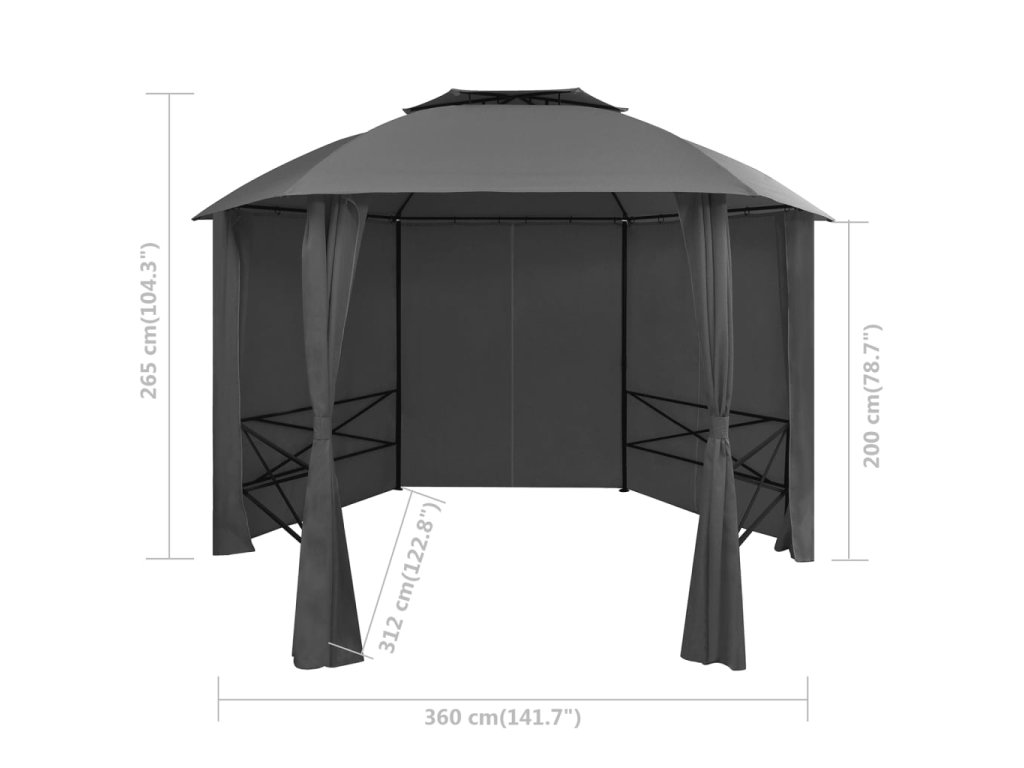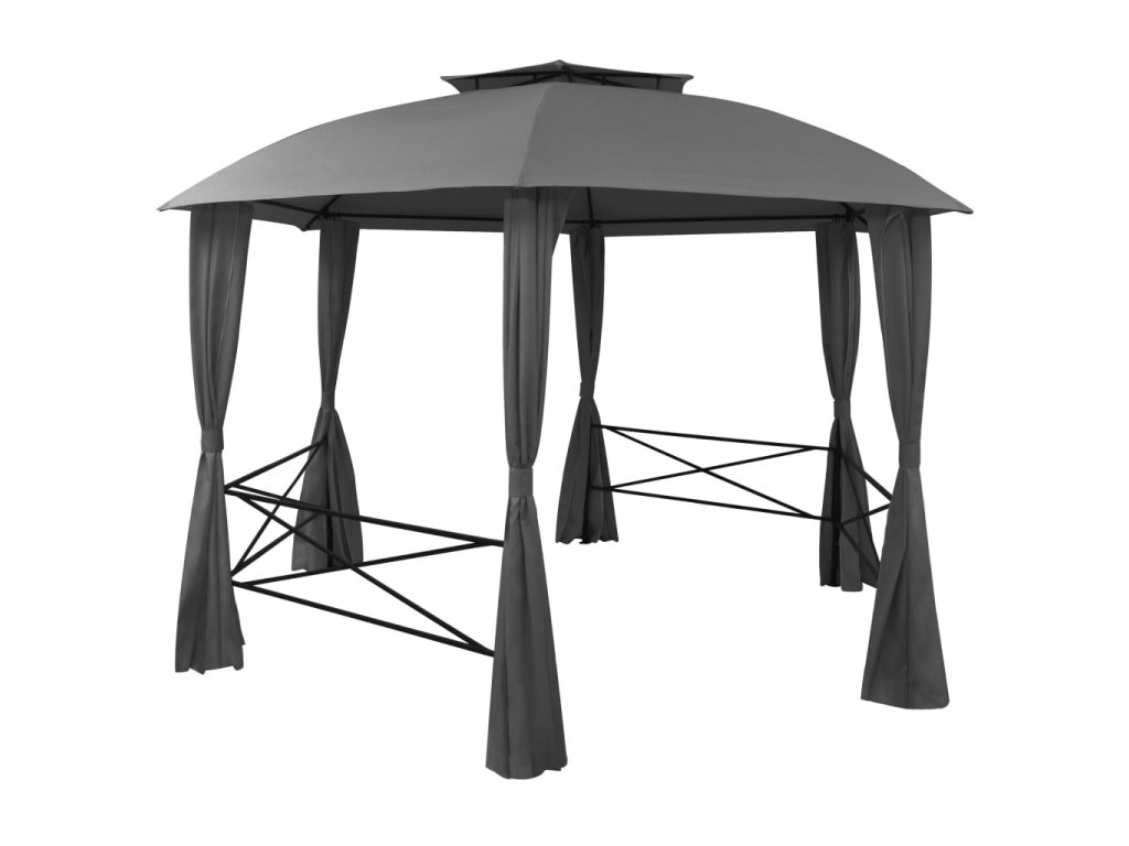 Střecha a závěsy altánu jsou vyrobené z polyesteru potaženého PA vrstvou, takže jsou nepromokavé. Bytelný rám je vyrobený z pevné oceli s práškovým nástřikem a altán je stabilní a nerezaví. Stylová stříška navíc zaujme svým dvoupatrovým provedením, které napomáhá proudění vzduchu. Polyesterové závěsy lze zatáhnout nebo je sepnout přiloženými stužkami a nechat je otevřené.