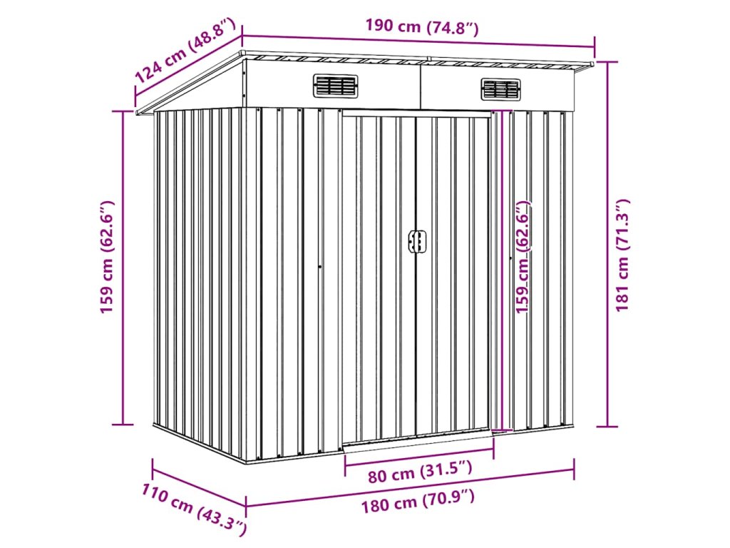- Praktický design: Tento skladovací domek má v přední části 2 větrací otvory, které zajišťují vynikající větrání. Dvojité posuvné dveře v přední části umožňují snadný vstup a výstup.