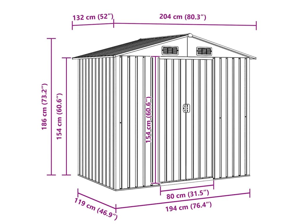 - Rozměry se střechou: 204 x 132 x 186 cm (Š x H x V)