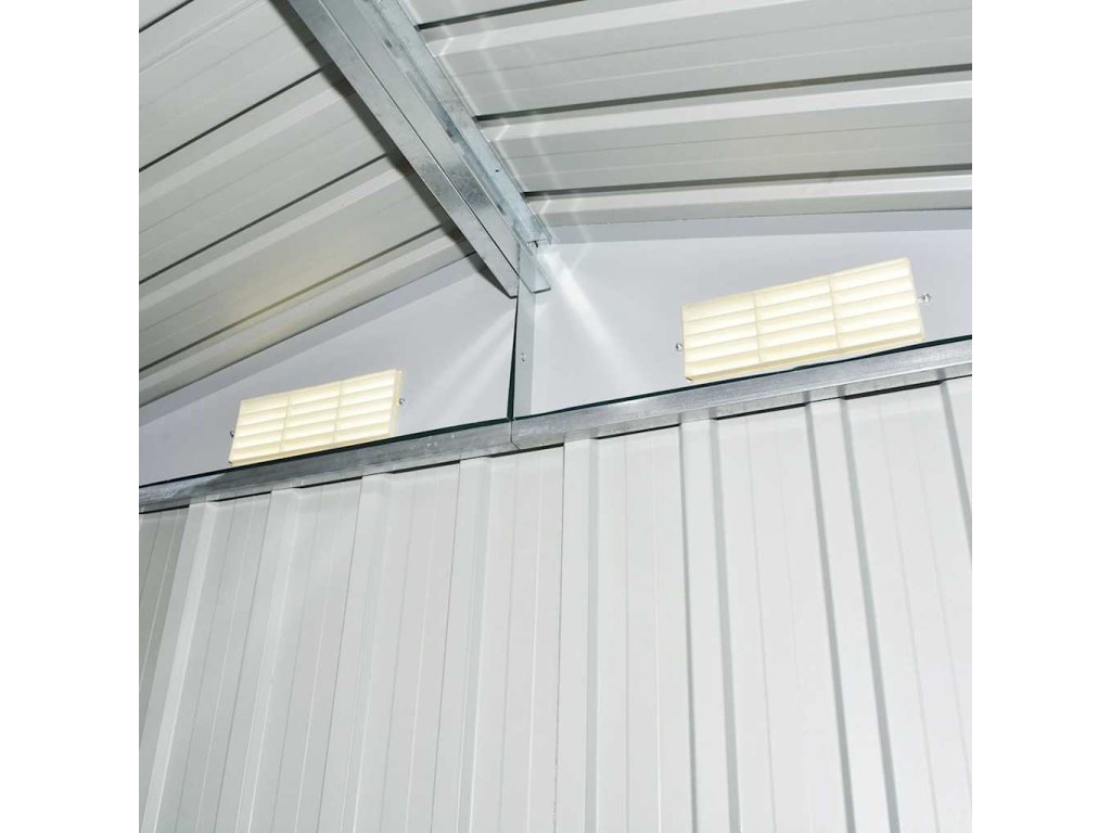 Díky konstrukci z pozinkované oceli je tato kůlna odolná a pevná, takže nepodléhá korozi ani jiným vlivům extrémních povětrnostních podmínek. Obsahuje také ocelový podlahový rám, který zvyšuje její stabilitu a výborně se hodí pro založení dřevěné podlahy (dřevo není součástí balení).