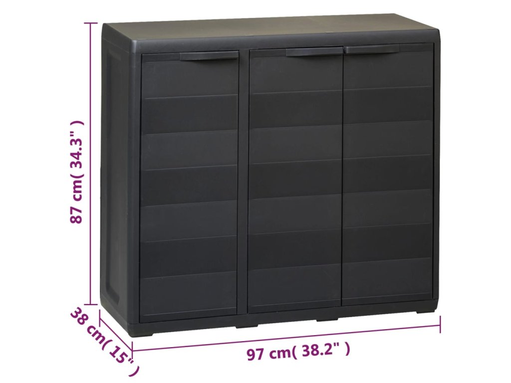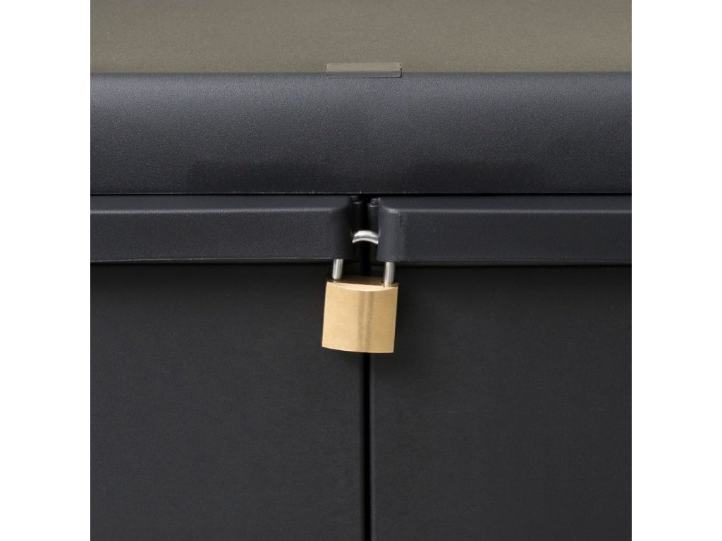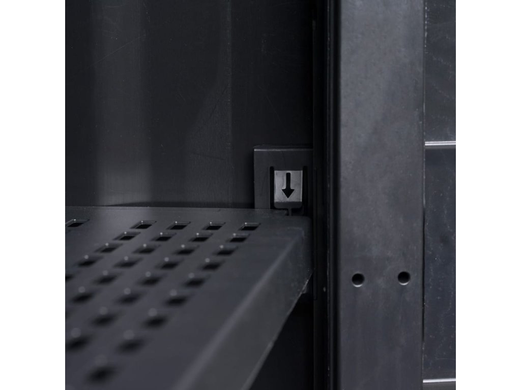 Tato skříň s certifikátem TÜV-GS je vyrobena z robustního odolného polypropylenu (PP). Skladovací skříňka má odvětrávané police, které lze nastavit tak, aby se do nich vešly předměty různých velikostí. Zahradní skříň se dá zamknout na zámek pro větší bezpečnost (zámek není přiložený).