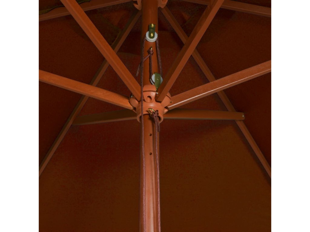 Stříška slunečníku je vyrobená z polyesterové tkaniny, která nepropouští škodlivé UV záření a nebledne, a poskytne vám optimální ochranu před sluncem. Navíc se snadno čistí. Průměr tyče je 38 mm a můžete ji namontovat na stávající stojan nebo doprostřed stolů s otvorem na slunečník. Silná dřevěná tyč se 6 odolnými žebry zajišťuje stabilitu a odolnost konstrukce. Zahradní slunečník je vybavený kladkovým mechanismem, takže se snadno otevírá i zavírá.