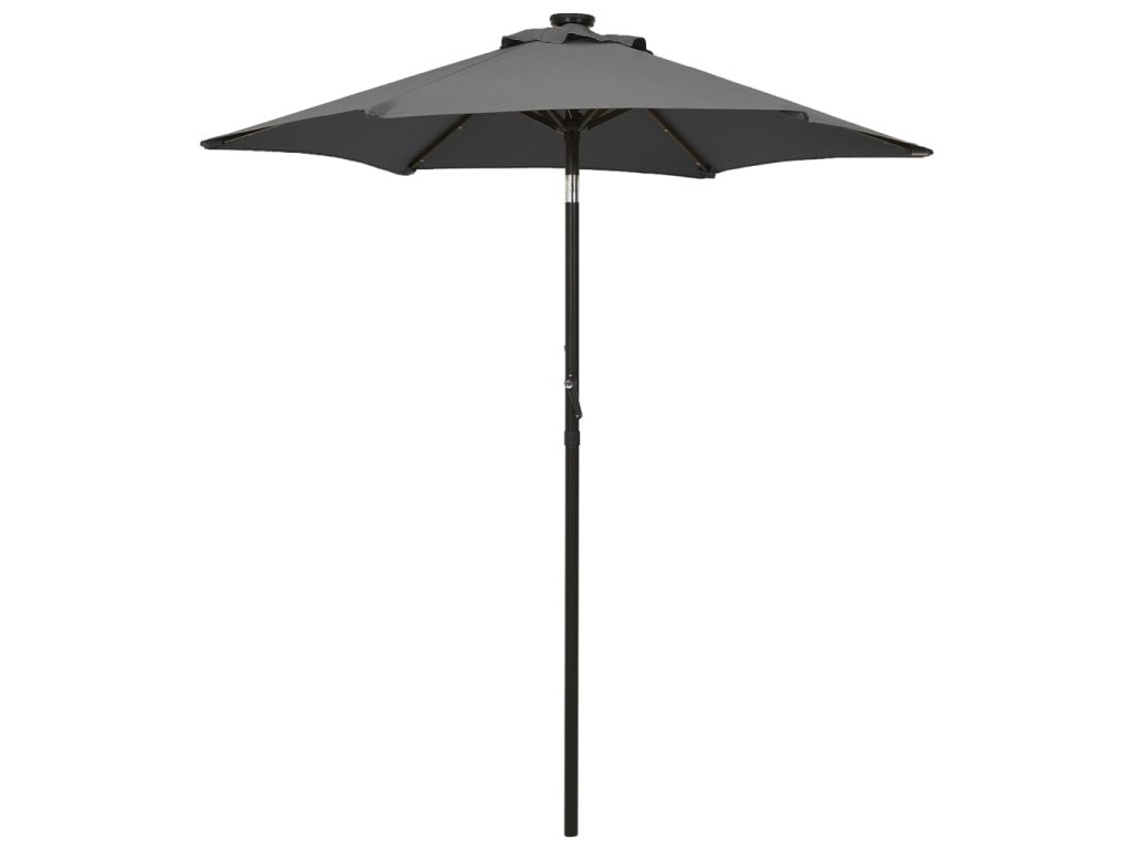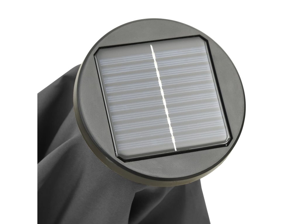 Slunečník má naklápěcí design a kliku, dá se tedy složit a přenášet. Je vyrobený z polyesteru, který výborně vzdoruje UV záření, nebledne a poskytuje optimální ochranu před slunečními paprsky. 6 kovových ramen pro lepší stabilitu vám společně s robustní tyčí z práškově lakovaného hliníku zaručí, že vám tenhle slunečník vydrží spolehlivě sloužit po mnoho let. Součástí je navíc 12 LED diod, které vám pomohou osvětlit vaše venkovní bydlení a navodit si po setmění útulnou a romantickou atmosféru.