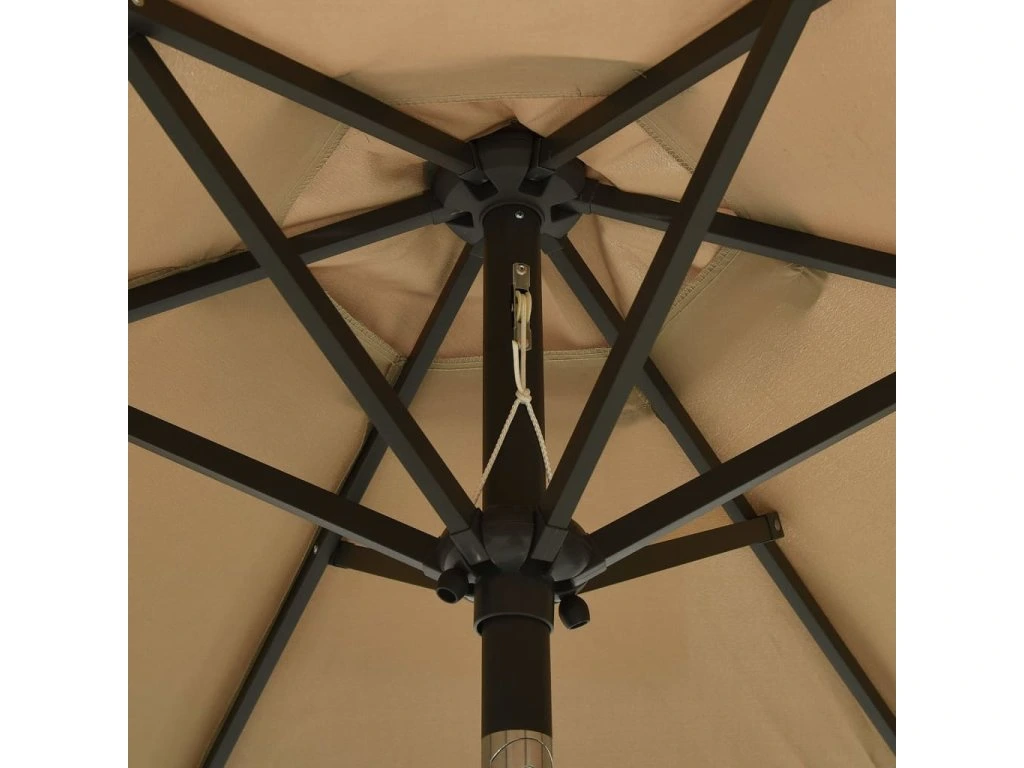 Slunečník má naklápěcí design a kliku, dá se tedy složit a přenášet. Je vyrobený z polyesteru, který výborně vzdoruje UV záření, nebledne a poskytuje optimální ochranu před slunečními paprsky. 6 kovových ramen pro lepší stabilitu vám společně s robustní tyčí z práškově lakovaného hliníku zaručí, že vám tenhle slunečník vydrží spolehlivě sloužit po mnoho let. Součástí je navíc 12 LED diod, které vám pomohou osvětlit vaše venkovní bydlení a navodit si po setmění útulnou a romantickou atmosféru.