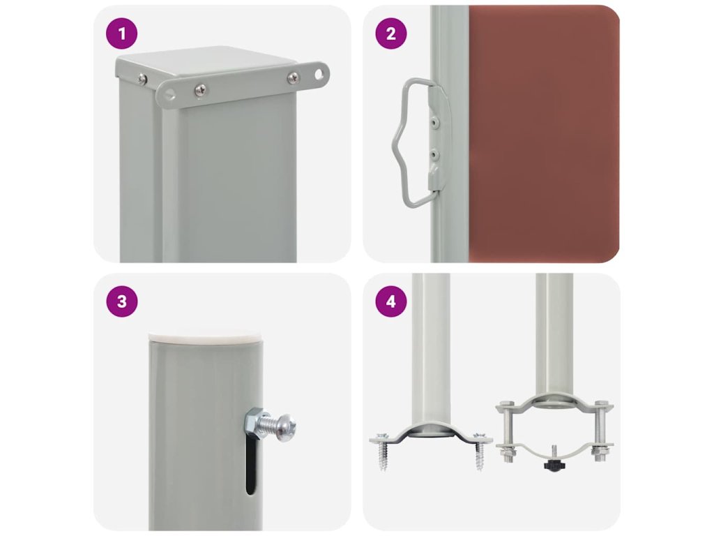 Zástěna je vyrobena z polyesteru, který je odolný proti UV záření a netrhá se. Kazeta, z níž boční markýzu snadno roztáhnete, je ve vertikální pozici posazena na bytelné železné základně. Markýza rovněž disponuje funkcí automatického srolování. Její sestavení je jednoduché.