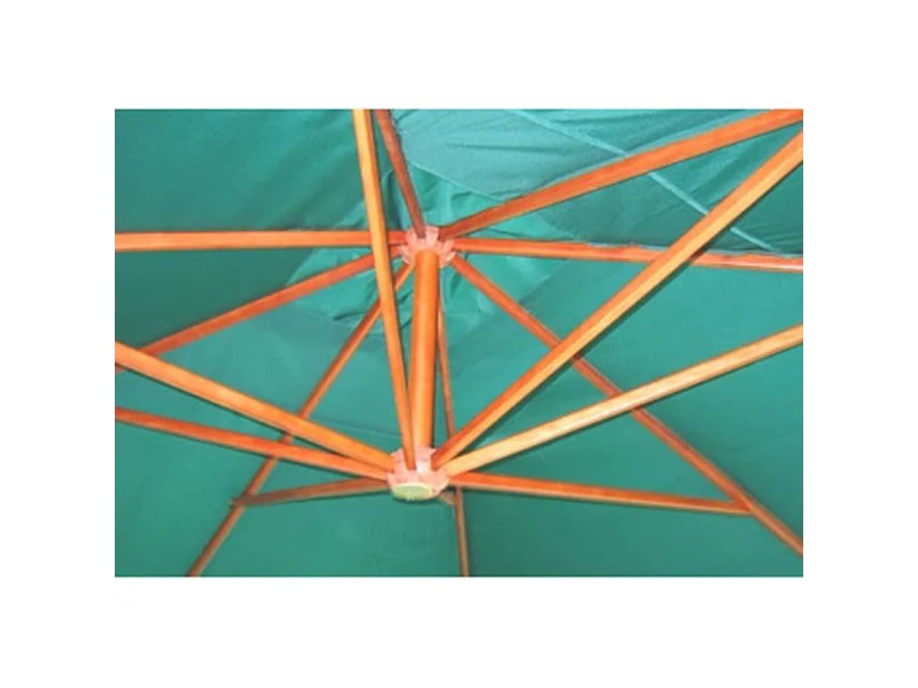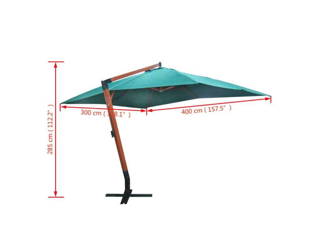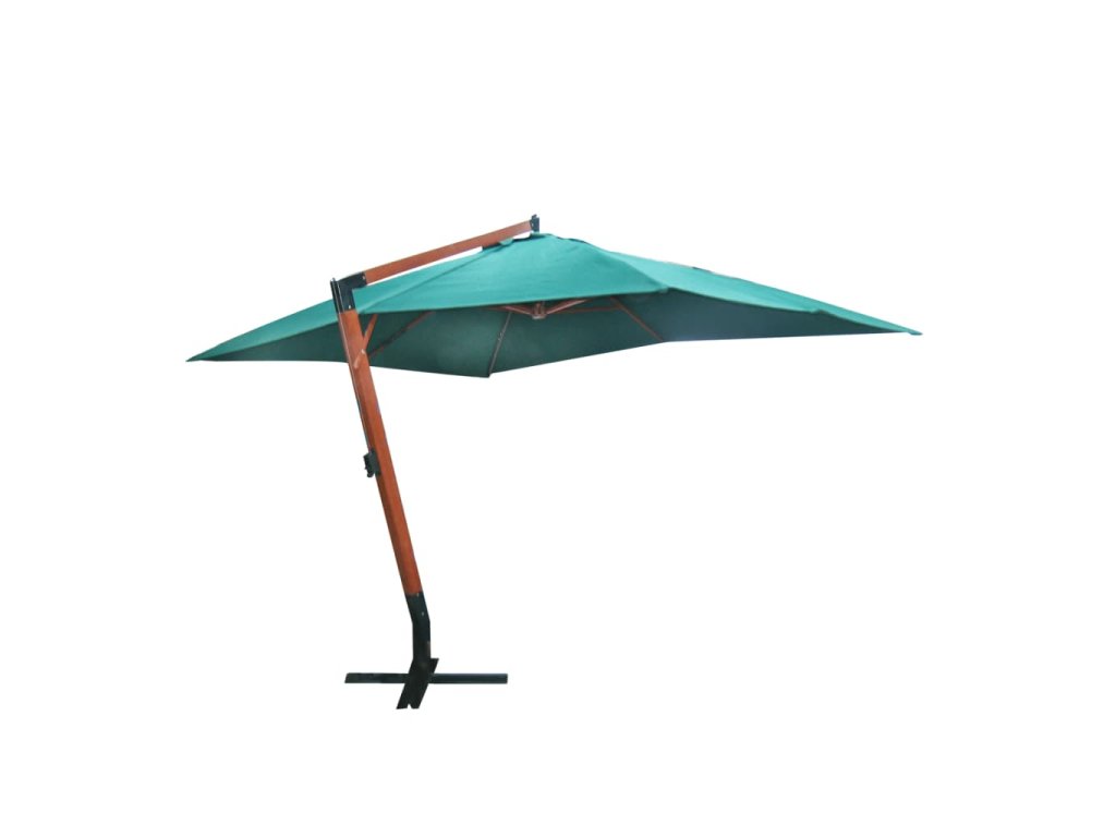 Krásný velký závěsný slunečník s dřevěným stojanem. Rozměry střechy jsou 3 x 4 metry. Střecha, vyrobená ze zeleného polyesteru, je volně zavěšena na stojanu, který je vyroben z modifikovaného tvrdého dřeva. Polyester chrání před sluncem i vlhkostí, takže plísně a bakterie nemají šanci.