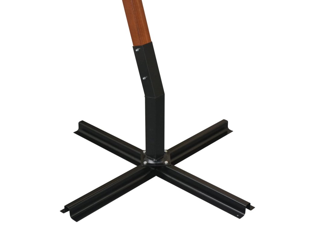 Střecha slunečníku je vyrobená z polyesterové tkaniny, která neztrácí barvu a je odolná vůči UV záření, takže zajišťuje optimální ochranu před sluncem. Slunečník má pevnou tyč z masivního jedlového dřeva, 8 odolných bambusových žeber a základnu ve tvaru kříže, je tudíž velmi stabilní. Stříška slunečníku volně visí z tyče, tyč proto nepřekáží v prostoru pod slunečníkem.