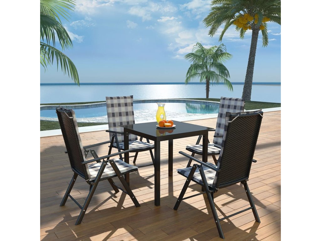 Stůl má moderní černou desku ze skla, která se snadno čistí. Židle ve stylovém a moderním provedení z PE ratanu mají opěradla, která lze nastavit do 7 pozic. Vždy si v nich tedy najdete pohodlnou pozici. Tato sada nábytku je velmi stabilní díky pevnému hliníkovému rámu s práškovým nástřikem. Součástí balení jsou polstry, které vám sezení ještě více zpříjemní. Pokud židle nepoužíváte, můžete je složit, aby nepřekážely. Celá naše sada tak do vaší zahrady nebo dvorku vnese trochu moderního stylu. Její sestavení je velmi snadné. Balení obsahuje 1 stůl, 4 židle a 4 polstry na židle.